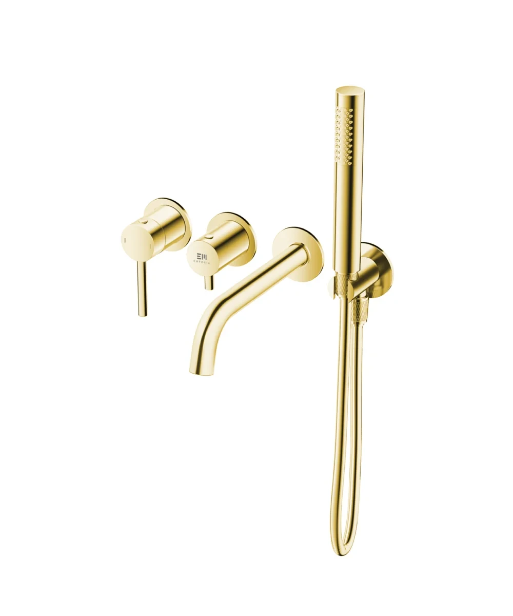 Podtynkowa bateria wannowa Emporia FLY w kolorze złotego połysku to kompletny system 4-otworowy, który wprowadza do łazienki atmosferę luksusu. Wykonana z trwałego mosiądzu armatura oferuje stałą wylewkę o zasięgu 195 mm oraz precyzyjną głowicę ceramiczną 35 mm. Zestaw zawiera dopasowaną 1-funkcyjną słuchawkę prysznicową z wężem antyskrętnym (1500 mm) oraz niezbędny moduł podtynkowy, co czyni go w pełni gotowym do instalacji ściennej.