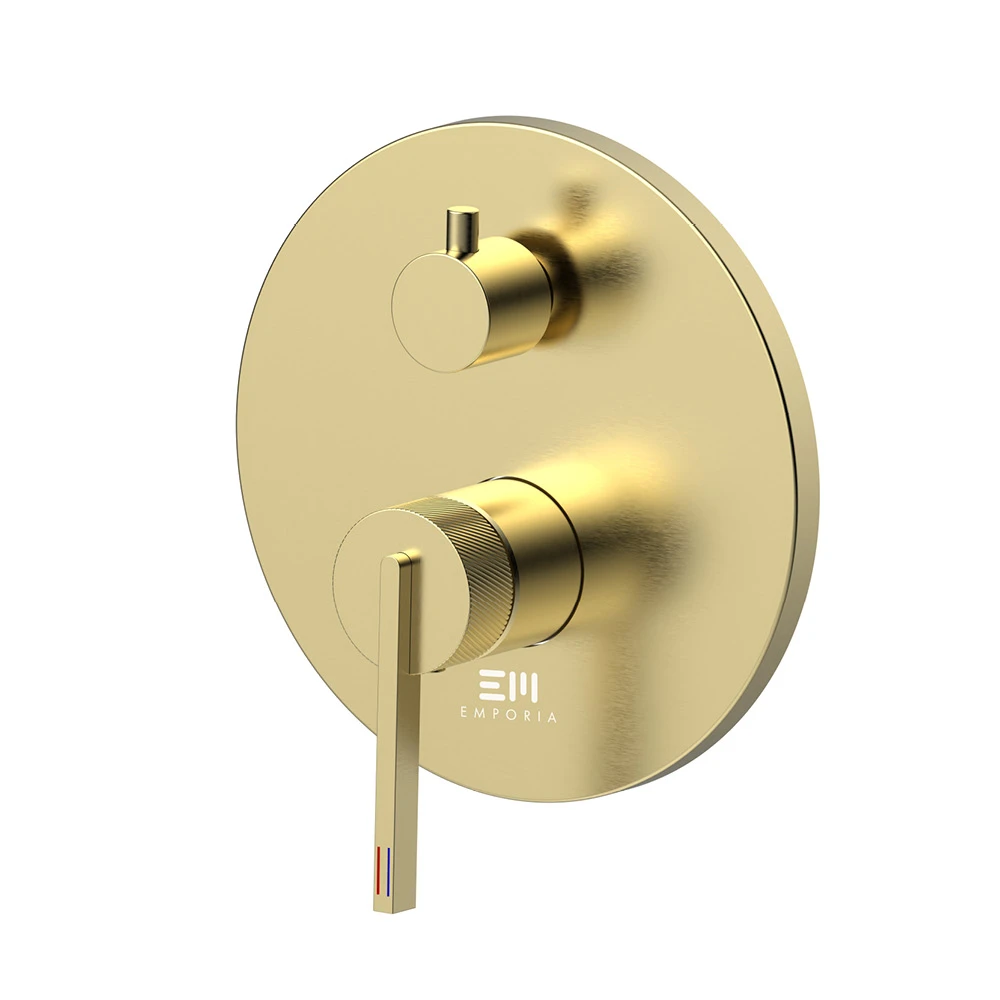 Podtynkowa bateria Emporia ORI w wykończeniu złoty szczotkowany to wszechstronne serce nowoczesnej strefy kąpielowej. Wyposażona w funkcjonalny box 3-wyjściowy, pozwala na jednoczesne podłączenie deszczownicy, słuchawki oraz wylewki wannowej. Dzięki zastosowaniu pancernej powłoki PVD oraz mosiężnej konstrukcji z ryflowanym detalem, armatura łączy luksusową estetykę z najwyższą odpornością na zarysowania.