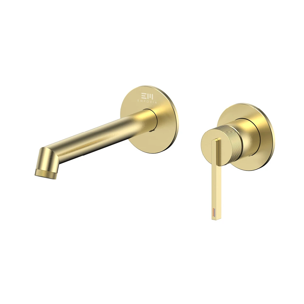 Podtynkowa bateria umywalkowa Emporia ORI w wykończeniu złoty szczotkowany to minimalistyczny system wyposażony w dwie estetyczne rozety oraz funkcjonalny box montażowy. Dzięki zastosowaniu technologii PVD, złota powierzchnia charakteryzuje się najwyższą odpornością na zarysowania i odbarwienia. Industrialny detal w postaci ryflowania oraz precyzyjna głowica ceramiczna czynią ją idealnym wyborem do nowoczesnych łazienek.