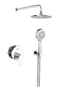 Podtynkowy zestaw natryskowy Kludi z serii LOUVA to kompletny pakiet armatury w wykończeniu chrom. Zestaw składa się ze sterującej baterii podtynkowej wraz z niezbędnym modułem instalacyjnym SLIM BOX (88022). Strefę kąpielową tworzy górna głowica osadzona na dedykowanym ramieniu oraz system ręczny obejmujący rączkę natrysku, przyłącze kątowe i przewód Suparaflex silver. Jest to w pełni kompatybilny pakiet, gotowy do kompleksowego montażu w przestrzeni prysznicowej.