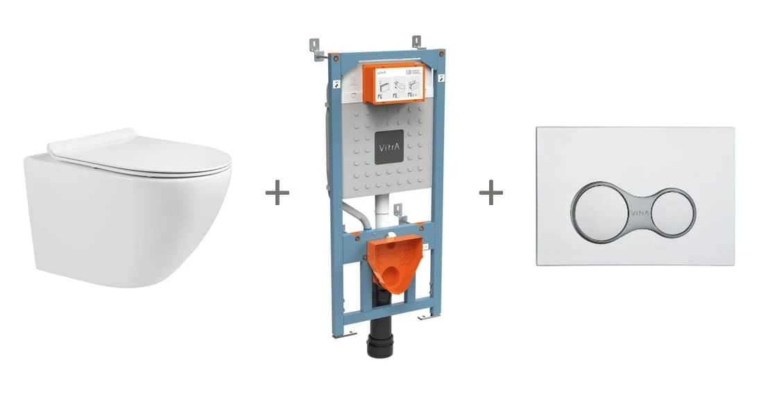 Bevisa Tavi Round 49 + stelaż VITRA 12 cm + przycisk VITRA Sirius chrom – zestaw WC podwieszany