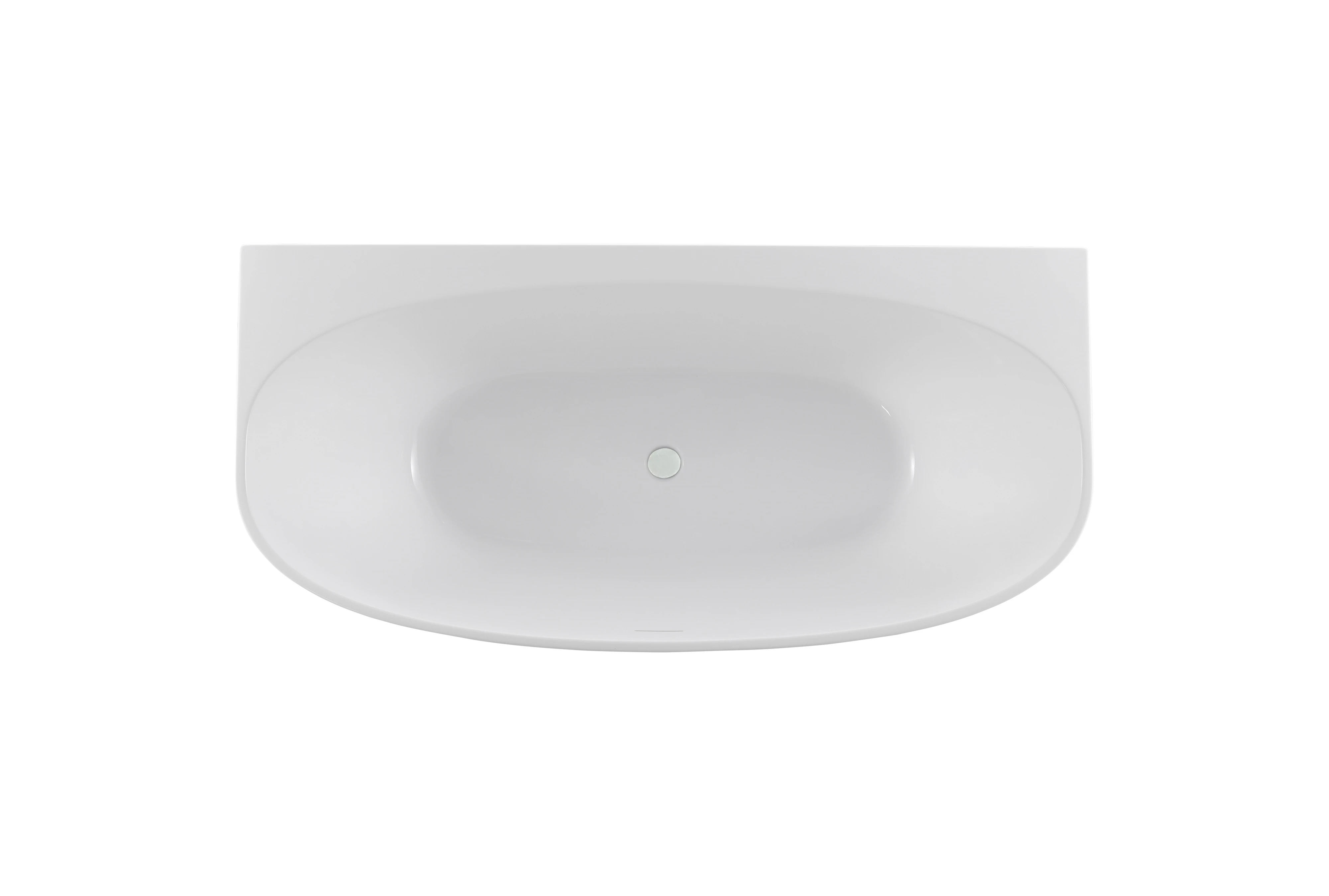 Śnieżnobiała, błyszcząca powierzchnia akrylu odbija światło, optycznie rozjaśniając pomieszczenie i nadając mu elegancki, uporządkowany wygląd. Owalna forma z delikatnie zaokrąglonymi krawędziami sprawia, że wanna prezentuje się harmonijnie i ponadczasowo, doskonale komponując się zarówno z nowoczesnymi, jak i bardziej klasycznymi aranżacjami łazienek.