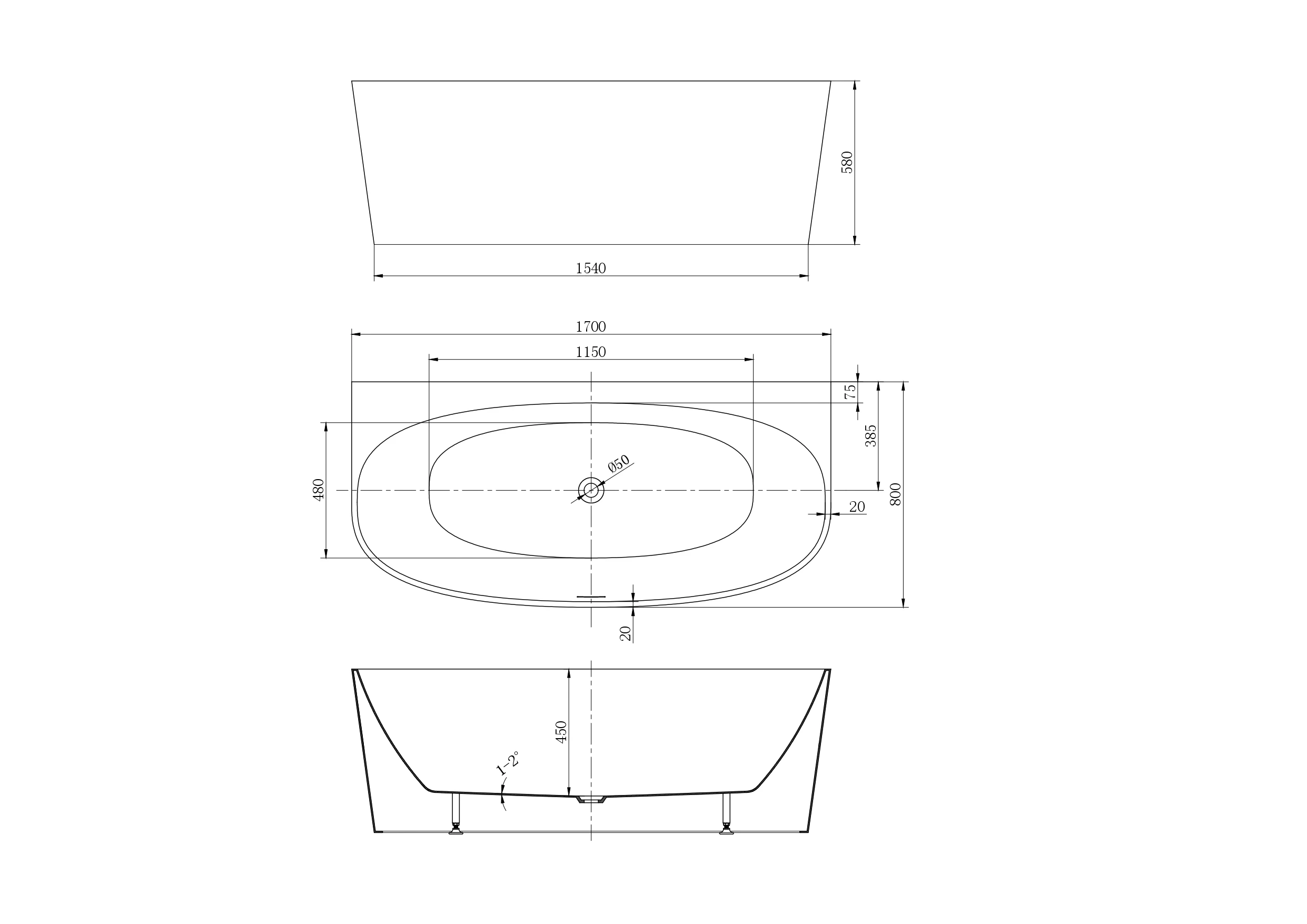 Bevisa Neris 170 Wanna wolnostojąca przyścienna akrylowa 1700x800x580 mm, z przelewem, biały korek 31503170