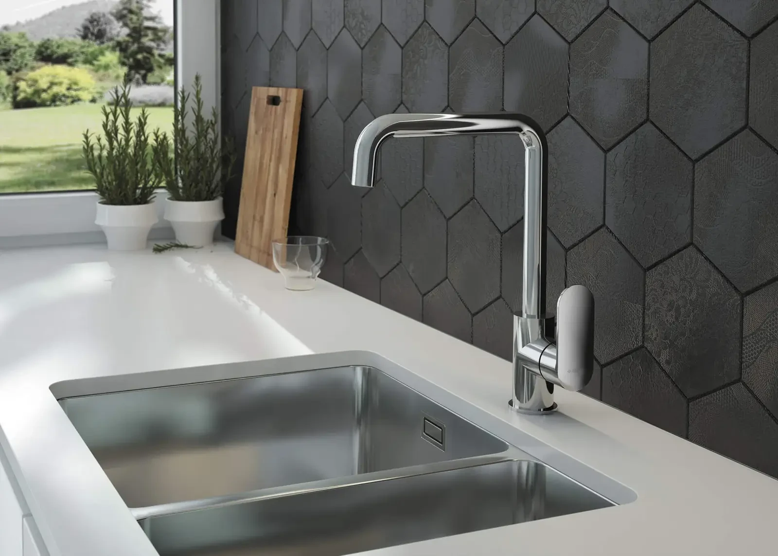 Stojąca bateria zlewozmywakowa Alpinia z prostokątną wylewką to nowoczesna i stylowa propozycja, która idealnie sprawdzi się w różnych stylizacjach przestrzeni kuchennych. Geometryczny kształt korpusu doskonale współgrać będzie ze zlewozmywakami o prostopadłościennych komorach, a także z surowymi, minimalistycznymi czy industrialnymi aranżacjami kuchni. Bateria w wykończeniu w tradycyjnym, błyszczącym chromie, z dźwignią z boku i korpusem umożliwiającym napełnianie wodą wysokich naczyń i ułatwiającym mycie warzyw, garnków czy rąk, wyposażona została także w aerator napowietrzający strumień.