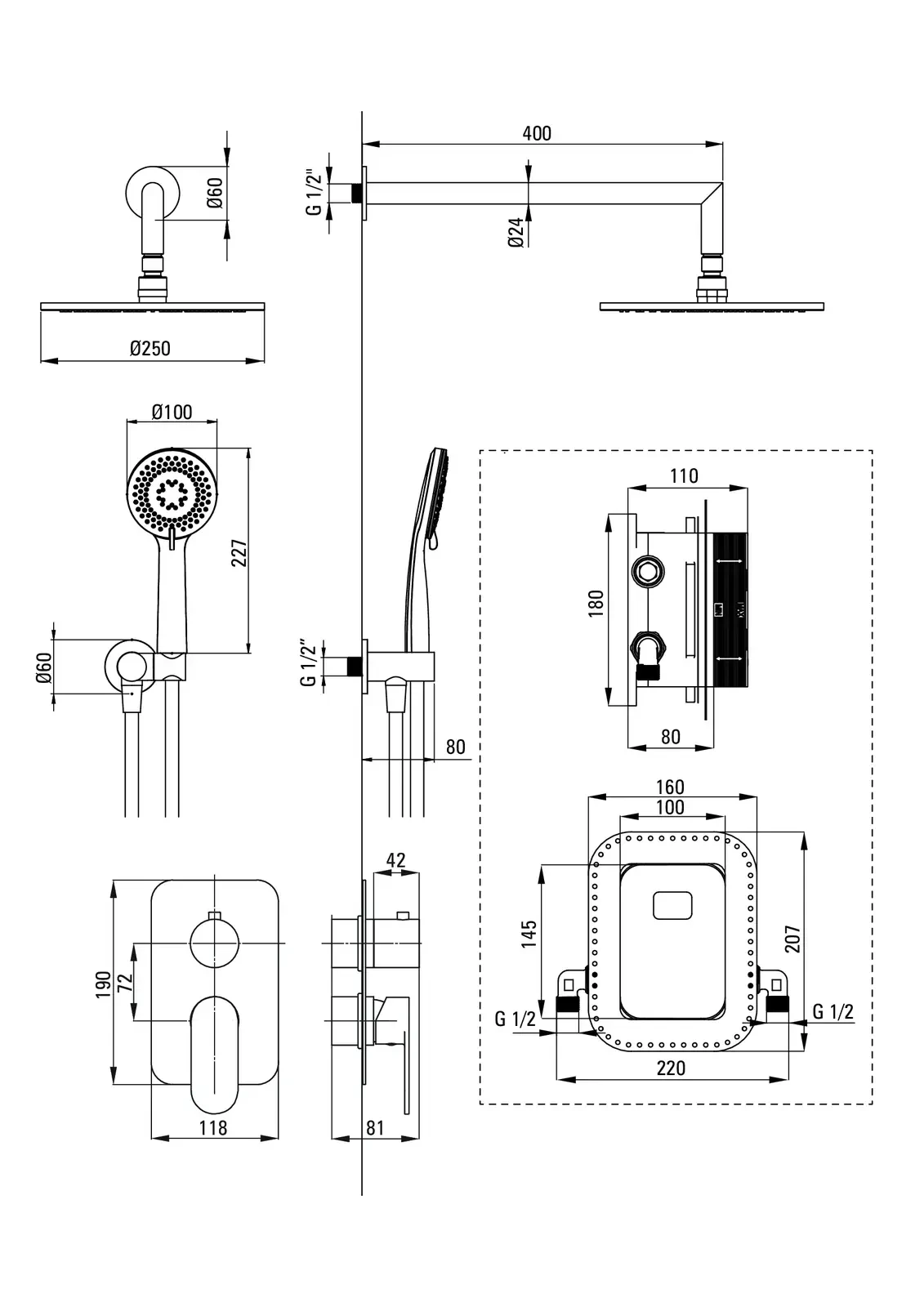 Zestaw prysznicowy składa się z BOXa, deszczowni i słuchawki wraz z uchwytem i wężem. Montaż podtynkowy charakteryzuje się nowoczesnym designem i wyjątkową estetyką. Box mieszaczowy wyróżnia się precyzją wykonania, wyposażony został w 3-funkcyjny przełącznik natrysku. Deszczownia o średnicy 25 cm zapewnia przyjemną i komfortową kąpiel. Słuchawka natryskowa posiada 3 funkcje: strumień deszczowy, hydromasaż, mieszany. Zarówno deszczownia jak i słuchawka wyposażone zostały w system anti-calc dzięki czemu są łatwe do utrzymania w czystości. Ruchome przyłącze kątowe do słuchawki pozwala na precyzyjne jej ustawienie, a wąż z systemem anti-twist zapobiega jego skręcaniu. Całość wykończona jest w efektownym złocie nadając łazience niepowtarzalnego charakteru.