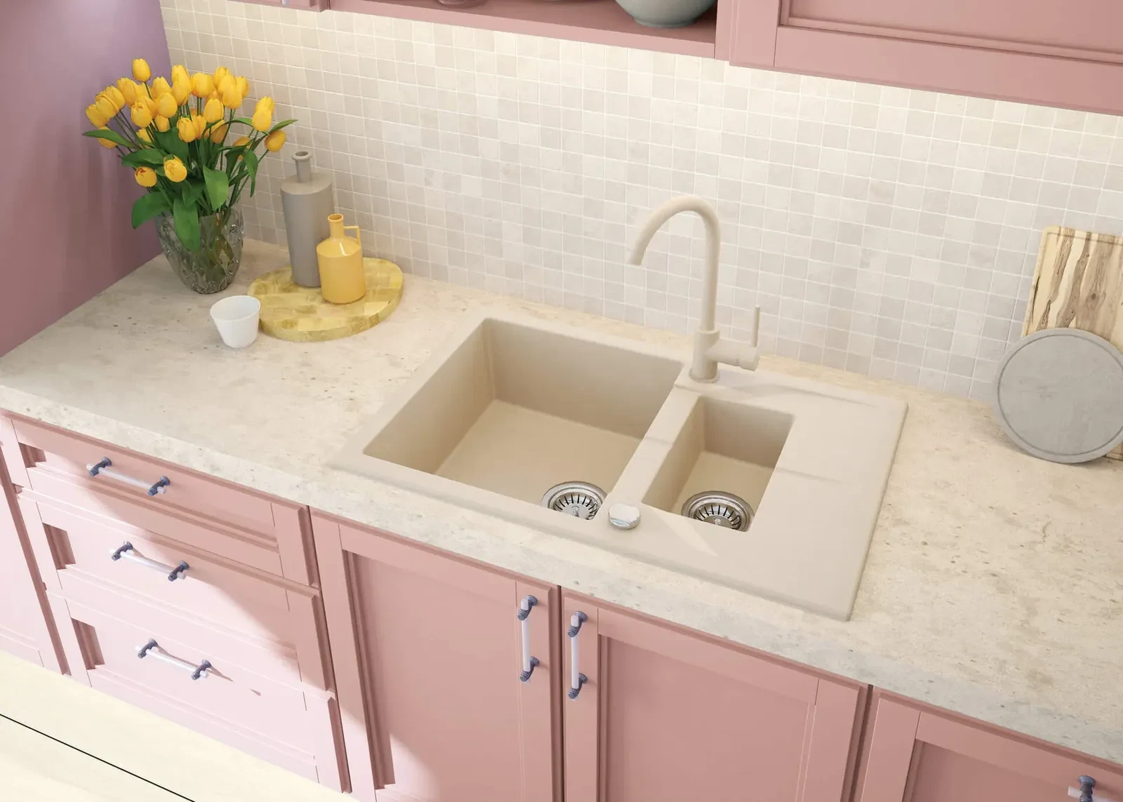 Neutralna forma wpisuje się w różne style aranżacji – od minimalistycznych po klasyczne. Wykończenie alabaster podkreśla estetykę i ułatwia dopasowanie.