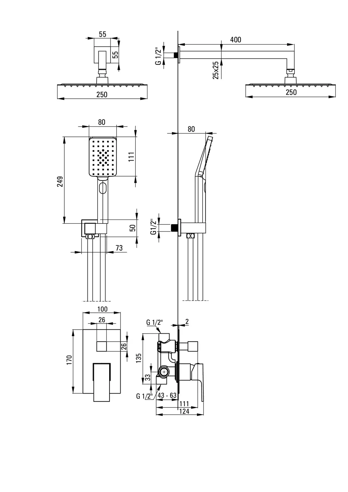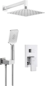 Zestaw prysznicowy podtynkowy w błyszczącym chromie pochodzi z kolekcji Anemon Bis. Główną cechą tej kolekcji są zrównoważone proporcje, stanowcze linie oraz kubistyczna forma. W skład zestawu wchodzi bateria mieszaczowa, słuchawka, uchwyt na słuchawkę, wąż PCV oraz głowica natryskowa. Bateria mieszaczowa posiada mechaniczny przełącznik natrysku, umożliwiający przełączenie źródła wody pomiędzy słuchawką a głowicą natryskową. Słuchawka prysznicowa ma 3 funkcje strumienia: strumień deszczowy, mgiełka wodna i mieszany. Duża kwadratowa głowica natryskowa wykonana jest z mosiądzu i posiada system anti-calc, ułatwiający czyszczenie jej z osadu i kamienia.