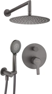 Natryskowy komplet podtynkowy z kolekcji Arnika Titanium to doskonały przykład połączenia klasycznych, naturalnych kształtów z innowacyjną kolorystyką, nowoczesnym designem i funkcjonalnością. W skład zestawu wchodzi bateria mieszaczowa z okrągłym panelem z dźwignią i mechanicznym przełącznikiem natrysku, umożliwiającym przełączanie źródła wody pomiędzy słuchawką a głowicą natryskową, uchwyt na słuchawkę wykonaną z mosiądzu z funkcją CoolOut, co oznacza, że rączka słuchawki nie nagrzewa się, wąż PCV w pasującym do kompletu kolorze oraz mosiężna, okrągła głowica natryskowa. Jak wszystkie produkty z linii Arnika Titanium, zestaw ten ma ciemny, przyjemny dla oka odcień szarości, który doskonale pasuje zarówno do białych, jak i czarnych elementów wyposażenia łazienki, a także drewnianych lub kamiennych blatów, czy mebli. System anti-calc ułatwia czyszczenie głowicy oraz słuchawki z osadu i kamienia.