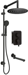 Komplet podtynkowy Arnika składa się z drążka ze słuchawką i głowicą deszczową, ze składanej wylewki oraz z boxa mieszaczowego z przełącznikiem natrysku. Uchwyt słuchawki można przesuwać do dowolnej pozycji. Słuchawka oraz głowica deszczowa wyposażone są w system Anti - calc, ułatwiający czyszczenie ich z osadu i kamienia. Wylewkę można podczas kąpieli złożyć równolegle do ściany. Tym sposobem zyskasz sporo miejsca, a w przypadku małych dzieci, również bezpieczną przestrzeń do zabawy. Komplet wykończony jest w czarnym matowym kolorze, co nadaje mu nowoczesnego i eleganckiego wyglądu, idealnie wpisującego się w trendy aranżacyjne łazienek o minimalistycznym lub industrialnym charakterze.