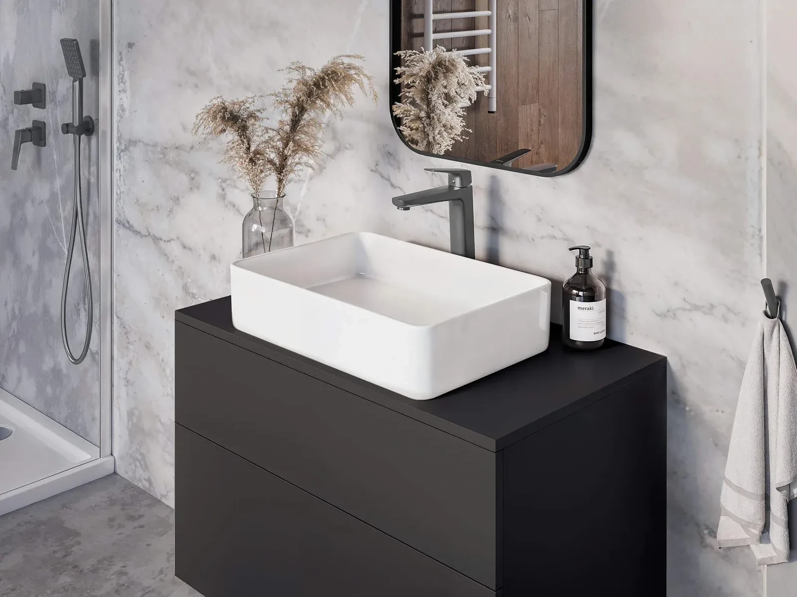 Neutralna forma wpisuje się w różne style aranżacji – od minimalistycznych po klasyczne. Wykończenie titanium podkreśla estetykę i ułatwia dopasowanie.