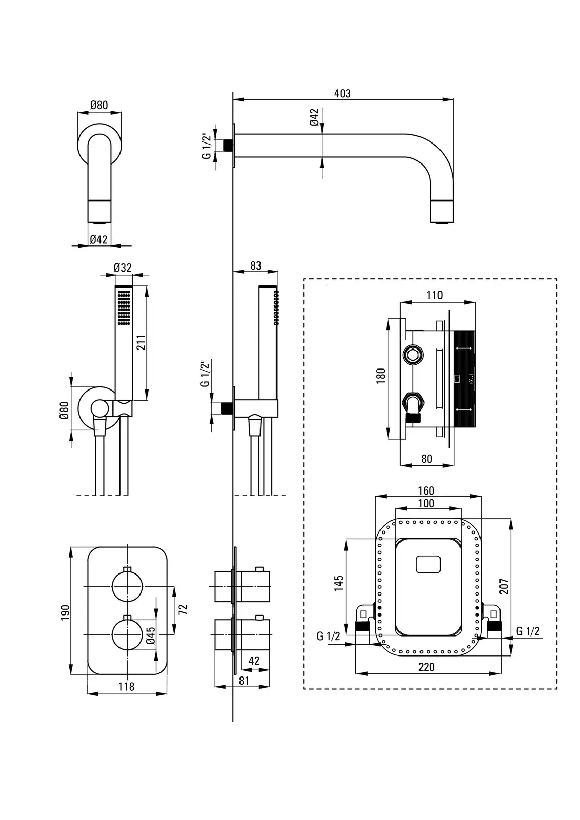 Komplet natryskowy to idealne połączenie nowoczesnego designu, funkcjonalności i komfortu użytkowania. Dzięki systemowi termostatycznemu gwarantuje precyzyjną kontrolę temperatury wody, eliminując ryzyko nagłych zmian i zapewniając bezpieczeństwo podczas kąpieli. Podtynkowy montaż sprawia, że cała instalacja jest estetycznie ukryta, co nadaje wnętrzu minimalistyczny i uporządkowany wygląd. Zestaw składa się z małej główki prysznicowej oraz ergonomicznej słuchawki z wężem i przyłączem kątowym. Główka prysznicowa zapewnia optymalny strumień wody w kształcie stożka. Całość wykończona jest w matowej bieli.