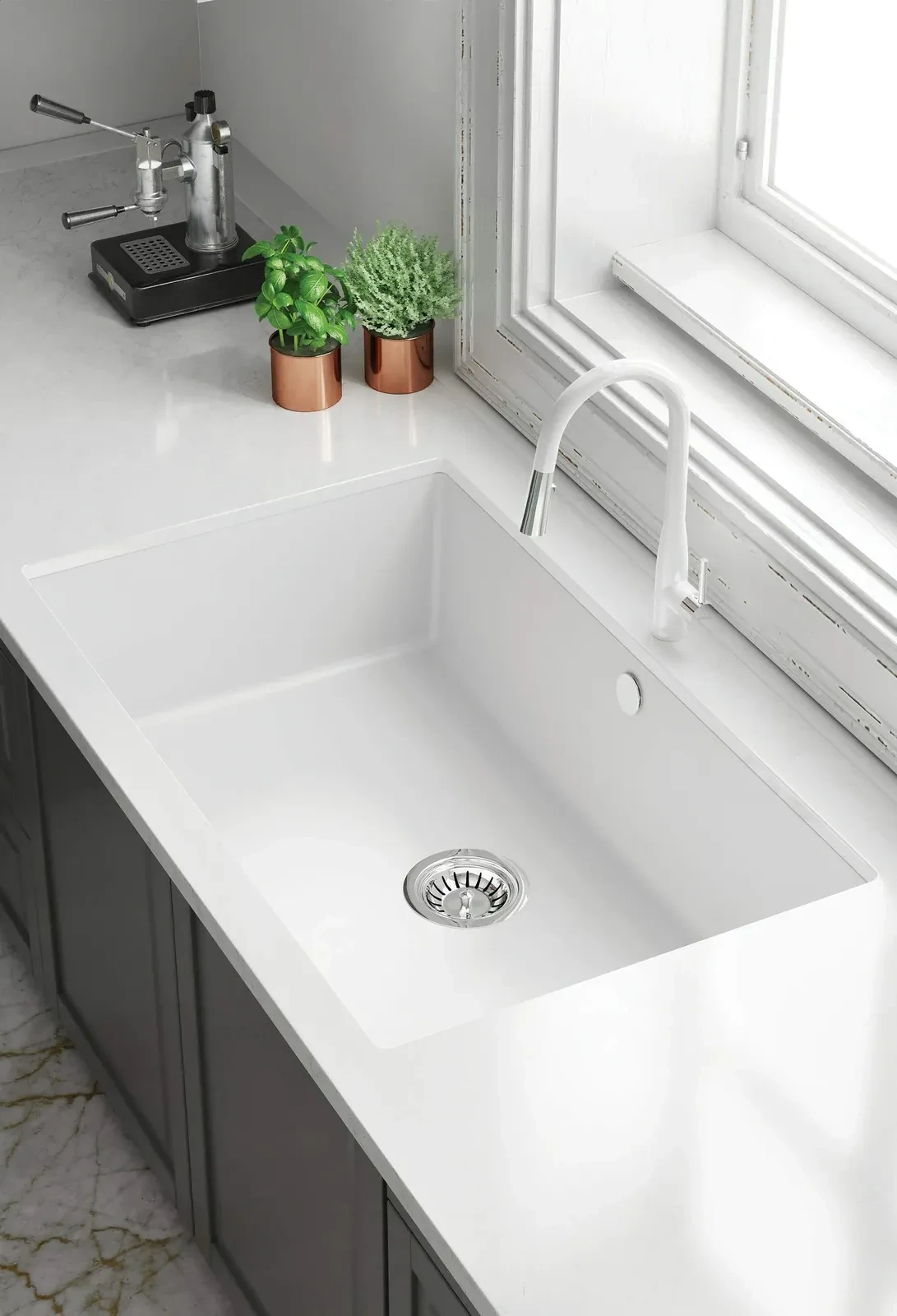 Jednokomorowy zlewozmywak Corda wykonany jest z trwałego granitu. Materiał ten charakteryzuje się niezwykłą odpornością na uderzenia, szok termiczny oraz przebarwienia - zgodnie z normą PN-EN 13310. Piękne alabastrowe wykończenie świetnie odnajdzie się zarówno w prowansalskich, jak i nowoczesnych kuchniach. W komplecie znajduje się także korek manualny oraz syfon oszczędzający miejsce Space-Saver. Deante w swojej ofercie proponuje również haczyk i reling, które idealnie pasują do modelu Corda.