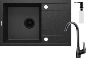 Komplet obejmuje zlewozmywak granitowy wraz z osprzętem, baterię kuchenną oraz dozownik płynu do mycia naczyń. Kupując gotowy zestaw, masz pewność, że wszystko idealnie do siebie pasuje. Zlewozmywak wykonany jest z trwałego granitu, odpornego na uderzenia i wysoką temperaturę. Bateria wyposażona jest w aerator napowietrzający strumień wody oraz w obrotową wylewkę. Całość dopełnia dozownik płynu do mycia naczyń. Bateria i dozownik wykończone są w eleganckim czarnym macie i świetnie współgrają z ciemnym, grafitowym zlewozmywakiem. Cały zestaw z powodzeniem odnajdzie się w nowoczesnej kuchni, która uwielbia innowacje i maksymalnie wykorzystuje przestrzeń.
