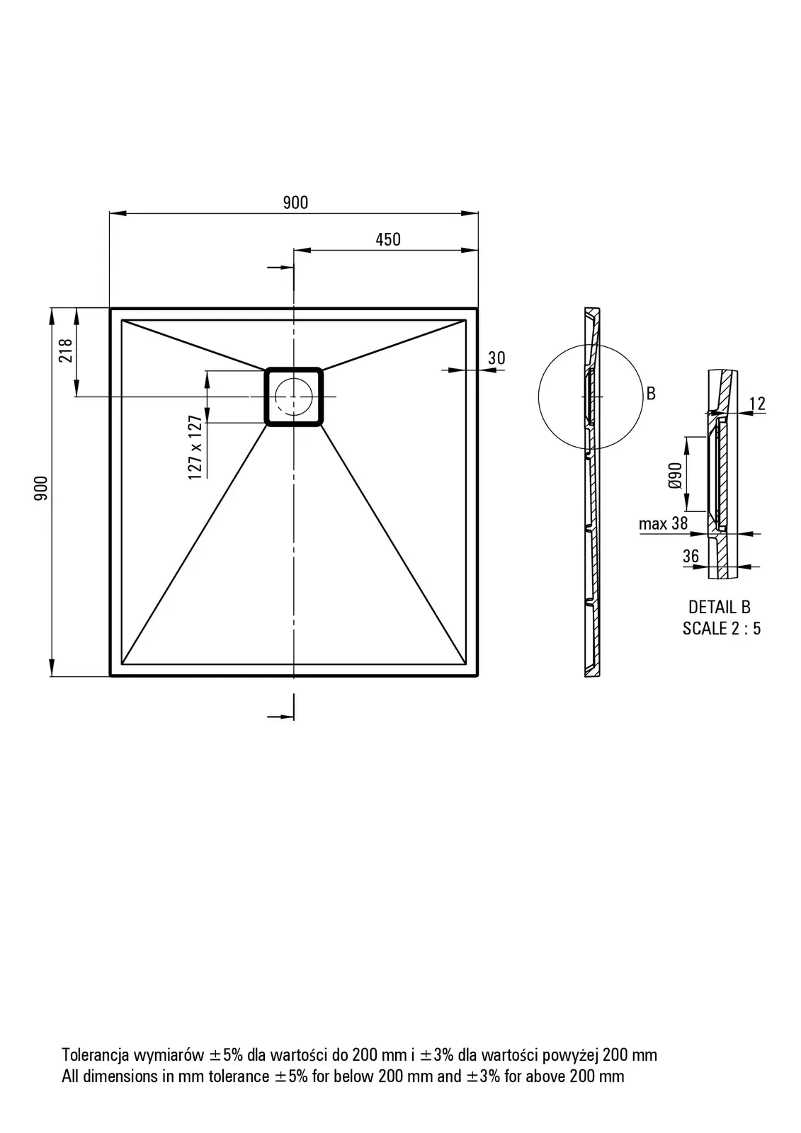 Deante Correo Brodzik granitowy kwadratowy 90x90 cm – dane techniczne i specyfikacja