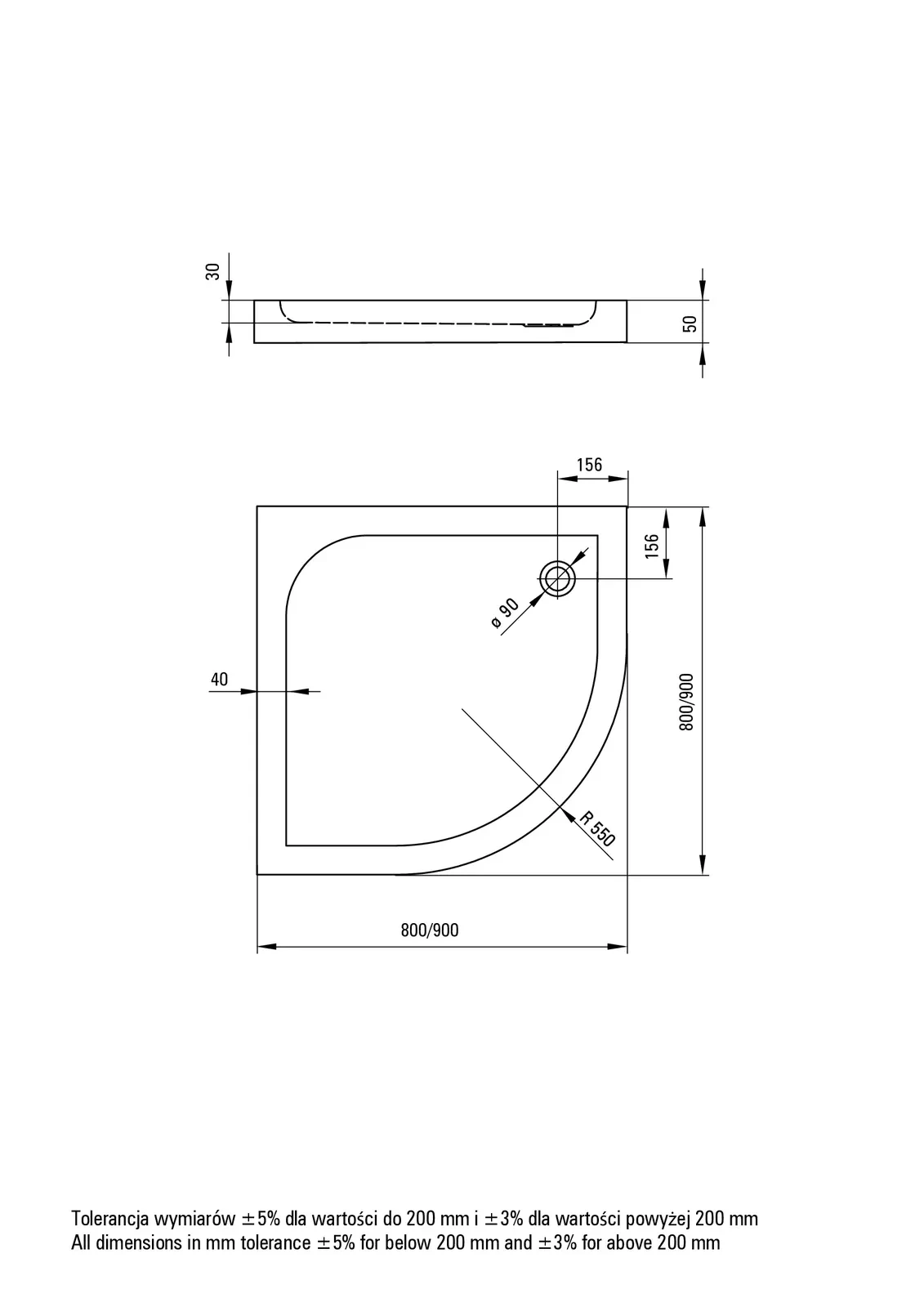 Deante Cubic Brodzik akrylowy półokrągły 90x90 cm – dane techniczne i specyfikacja