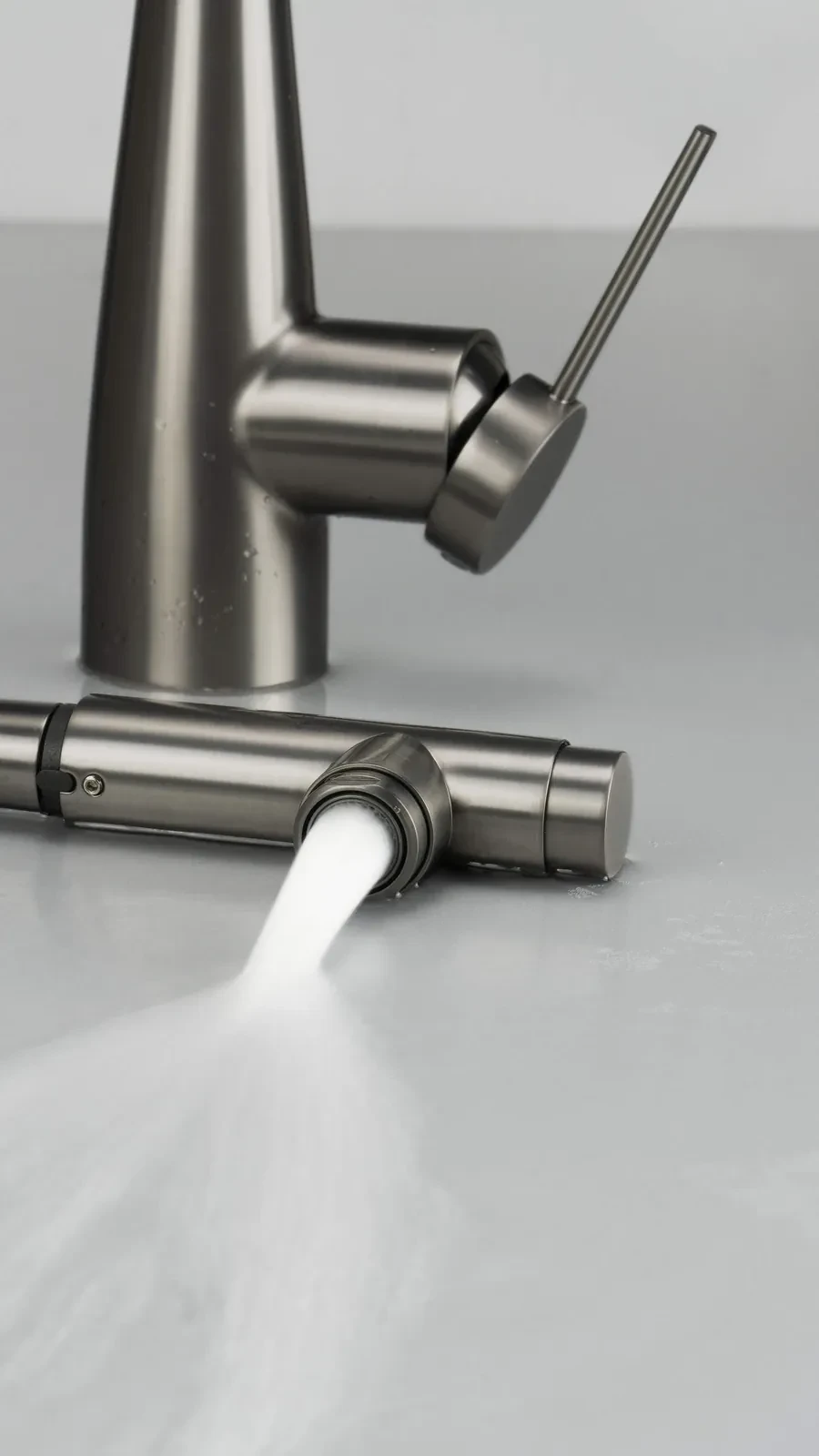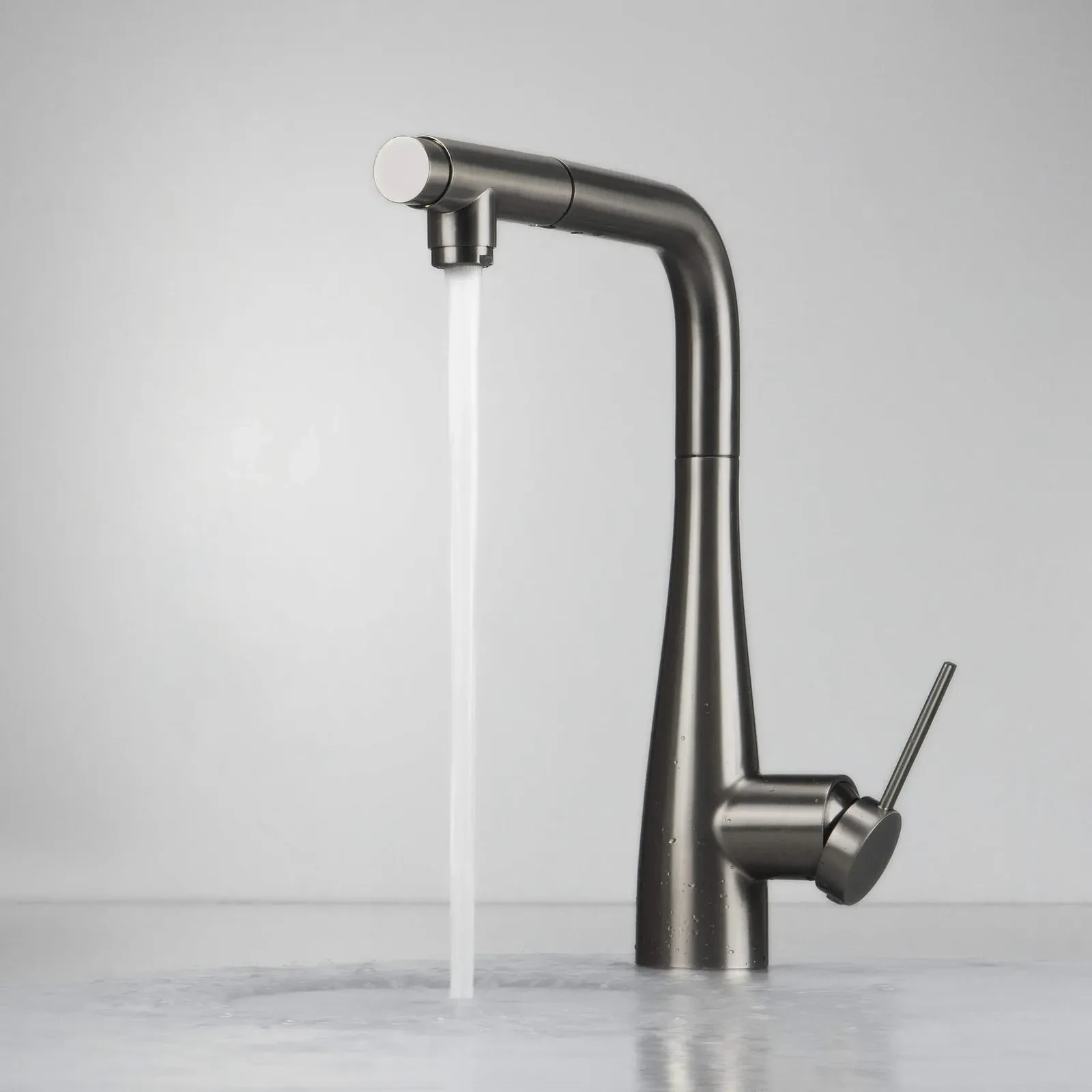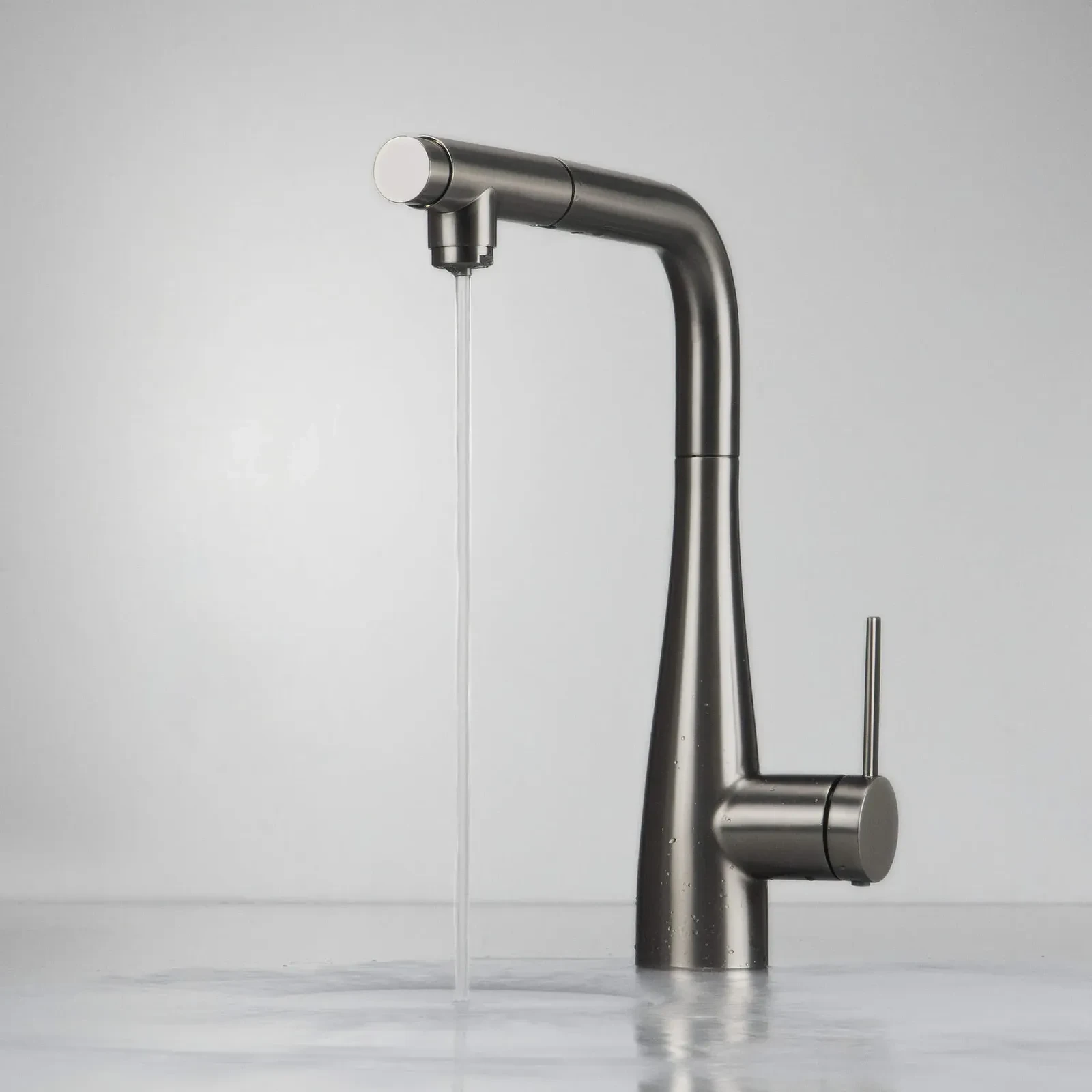 Bateria Eridan to kwintesencja elegancji i innowacji w Twojej kuchni. Stworzona z najwyższej jakości stali, urzeka smukłym korpusem, który płynnie przechodzi od wąskiej góry do szerszej dolnej części. Jej nowoczesny design doskonale komponuje się z różnymi stylami wnętrz, dodając im wyjątkowego charakteru. Wbudowany aerator sprawia, że strumień wody jest napowietrzony, co zapewnia oszczędność i wygodę użytkowania. Eridan to więcej niż zwykła bateria kuchenna – to ekologiczny model, który troszczy się o środowisko i Twoje zdrowie. Dzięki unikalnemu podłączeniu do filtra wody, możesz cieszyć się czystą, filtrowaną wodą, naciskając przycisk Click na szczycie wylewki. Specjalny wężyk wewnątrz wylewki prowadzi wodę bezpośrednio z filtra, gwarantując jej najwyższą jakość. Wykończenie w oryginalnym kolorze Titanium, będącym połączeniem barwy brązowej, szarej i czarnej, wprowadza nowoczesny akcent do Twojej kuchni. Bateria doskonale komponuje się ze zlewozmywakiem granitowym z serii Eridan.