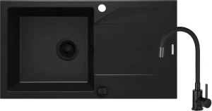 Komplet obejmuje zlewozmywak granitowy wraz z osprzętem oraz baterię kuchenną z elastyczną wylewką. Kupując gotowy zestaw, masz pewność, że wszystko idealnie do siebie pasuje. Zlewozmywak wykonany jest z trwałego granitu i wyposażony w korek automatyczny. Dołączony Syfon Space Saver dzięki teleskopowej budowie zajmuje bardzo mało miejsca w szafce. Natomiast bateria posiada elastyczną wylewkę, która ułatwia codzienne prace kuchenne takie jak napełnienie wodą dużych naczyń czy garnków. Całość wykończona w czarnym macie doskonale pasuje zarówno do nowoczesnych, jak i industrialnych wnętrz.