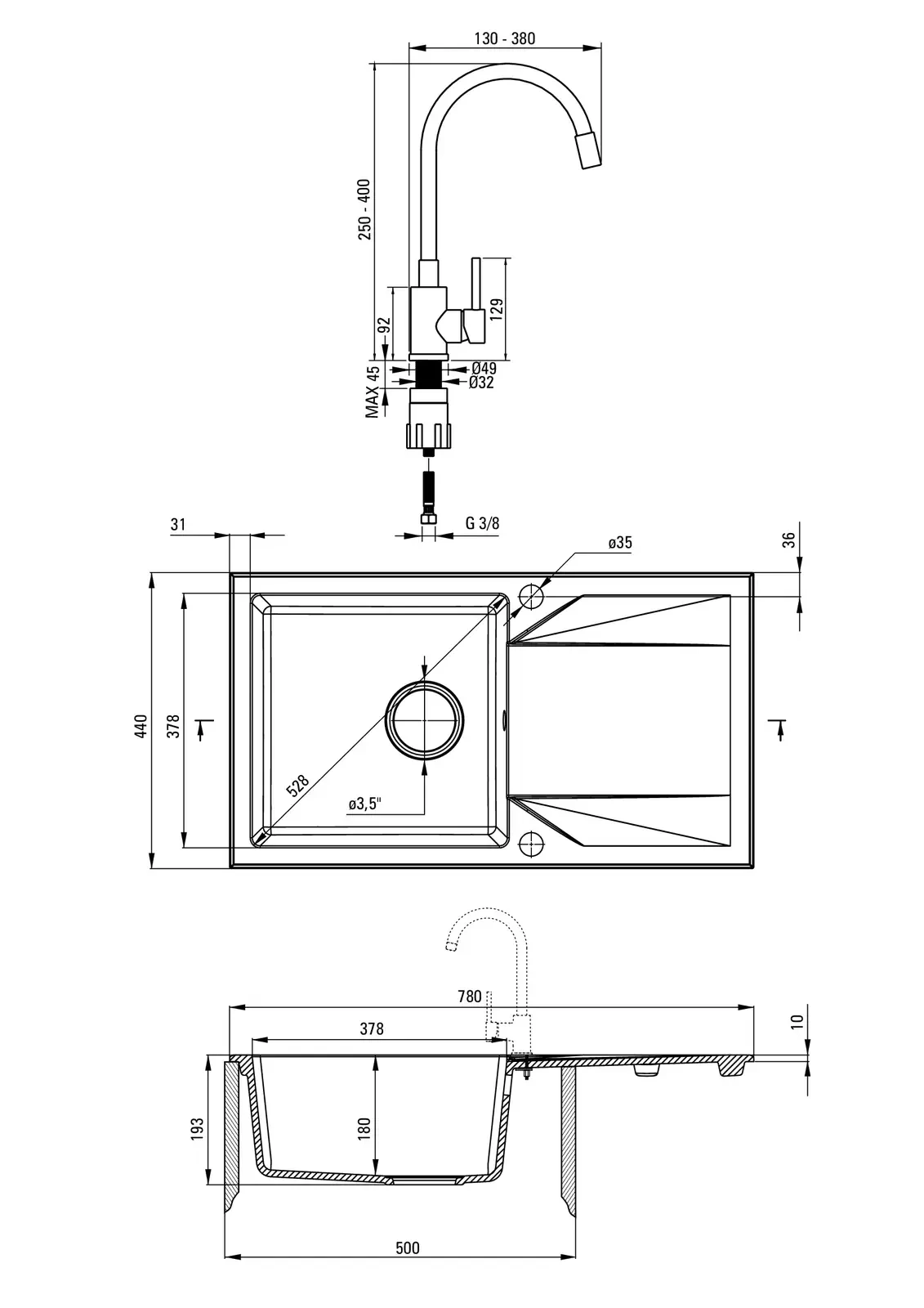 Deante Evora Zlewozmywak granitowy z baterią 1 – dane techniczne i specyfikacja