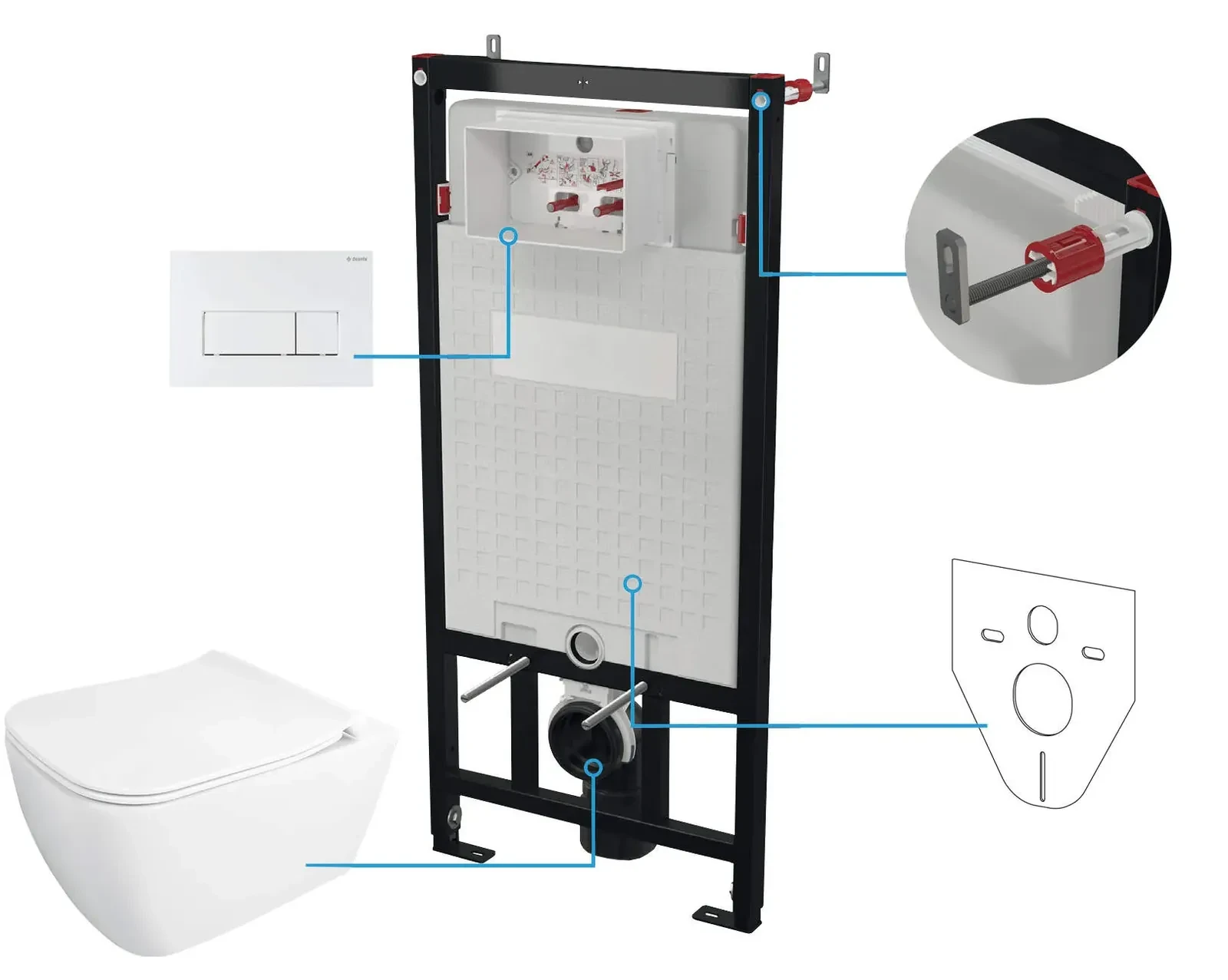 Zestaw podtynkowy WC składa się z wiszącej miski bezkołnierzowej, przycisku w wykończeniu bianco oraz maty wygłuszającej. Komfort korzystania z toalety zapewni wolnoopadająca deska i podkładka akustyczna, które mają za zadanie wygłuszać hałas. Miska pozbawiona kołnierza ułatwi zachowanie czystości, ponieważ nie posiada wszelkich randów i zakamarków. Mata wygłuszająca niweluje nierówności pomiędzy płytką i miską WC. Całość stabilizuje wytrzymała, stalowa rama.