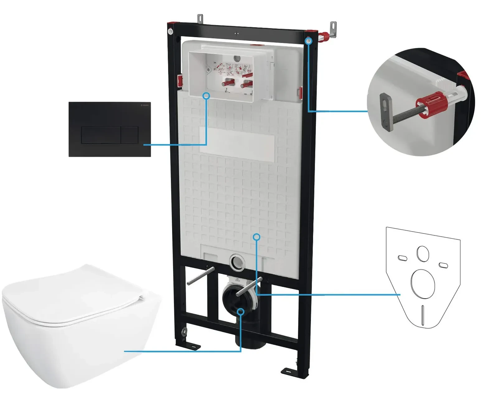 Podtynkowy zestaw WC oferowany jest z bezkołnierzową wiszącą miską, łatwo wypinającą się deską, przyciskiem o wykończeniu nero oraz matą wygłuszającą korygującą nierówności pomiędzy płytką i miską WC. Miska bez kołnierza ułatwia utrzymanie czystości, ponieważ pozbawiona jest wszelkich randów i zakamarków. Stalowy stelaż zapewnia trwałość konstrukcji. Dzięki desce wolnoopadającej i podkładce akustycznej komfort z korzystania z toalety jest znacznie większy. Całość wygląda bardzo elegancko i estetycznie.