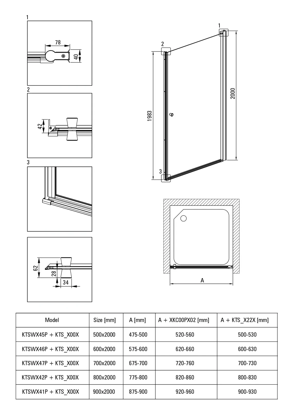 – Sposób instalacji: do kompletowania z drzwiami prysznicowymi KTS, do kompletowania z walk-in KTS
