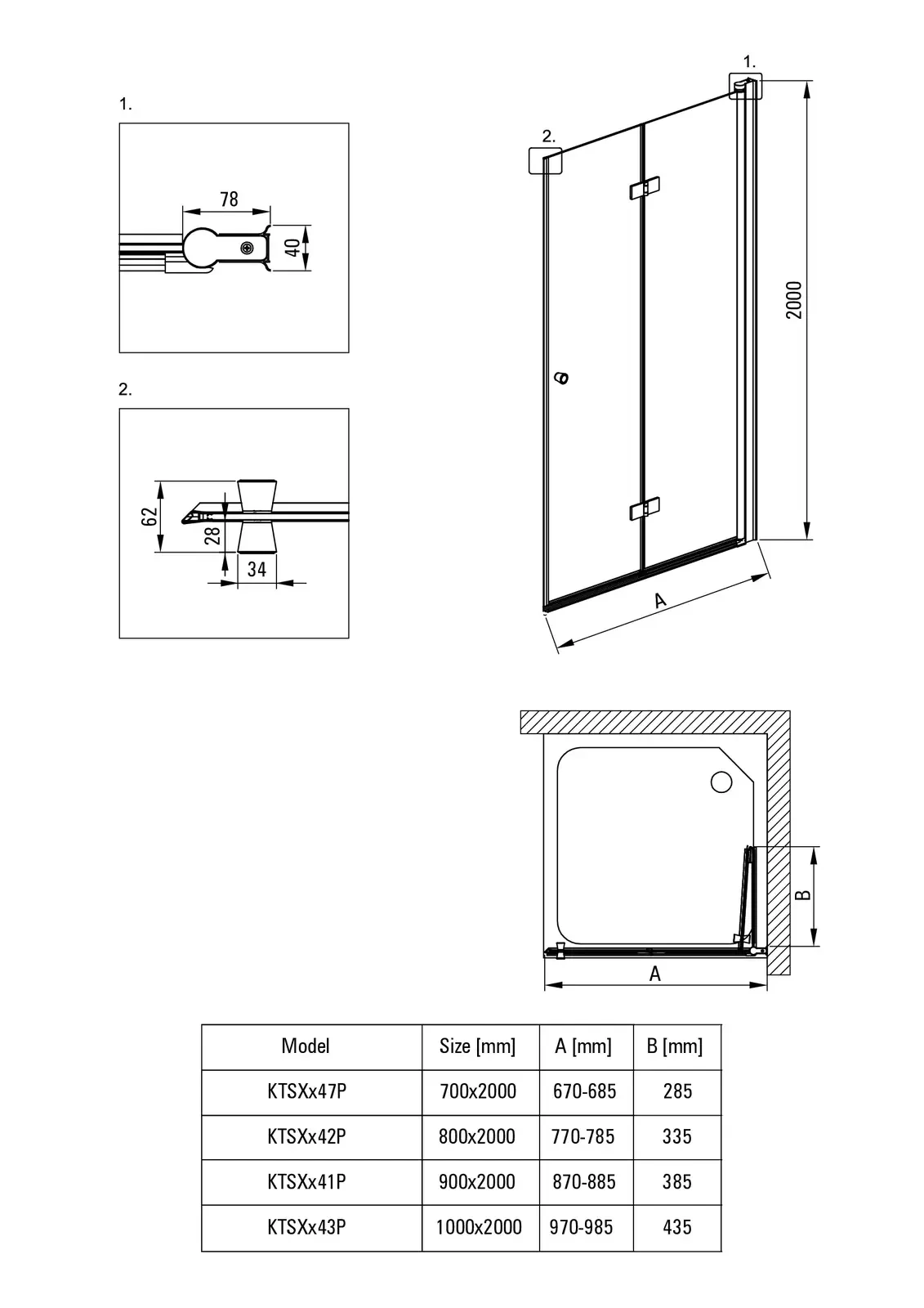Kabina składa się z drzwi składanych. Drzwi prysznicowe Kerria Plus wykonane są z 6 mm szkła hartowanego Total White. Jest to model odwracalny, tzn. z możliwością montażu na prawą lub lewą stronę. Drzwi pokryte są hydrofobową powłoką Active Cover, która znacznie ułatwia utrzymanie produktu w czystości. Eleganckie czarne wykończenie idealnie wpisuje się w nowoczesne i loftowe wnętrza. Drzwi mogą być zastosowane jako samodzielny produkt do wnęki lub jako element kabiny.
