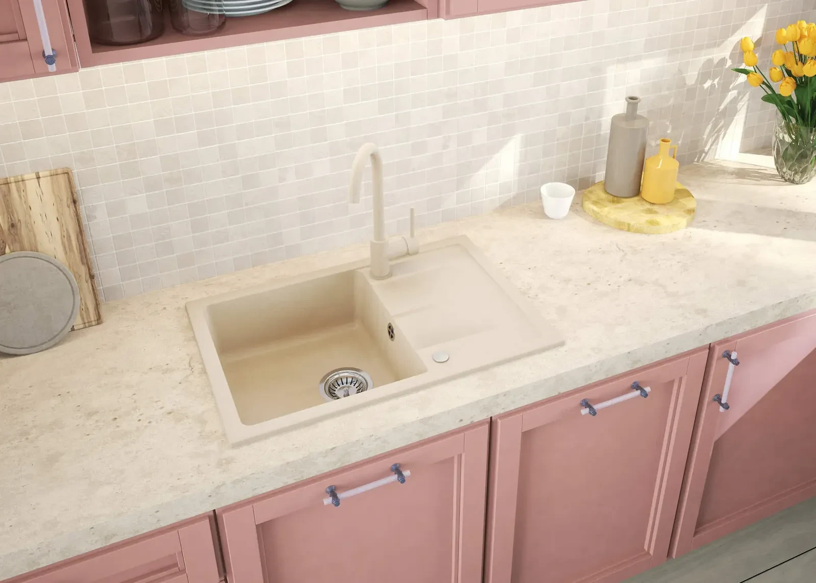 Neutralna forma wpisuje się w różne style aranżacji – od minimalistycznych po klasyczne. Wykończenie beż podkreśla estetykę i ułatwia dopasowanie.