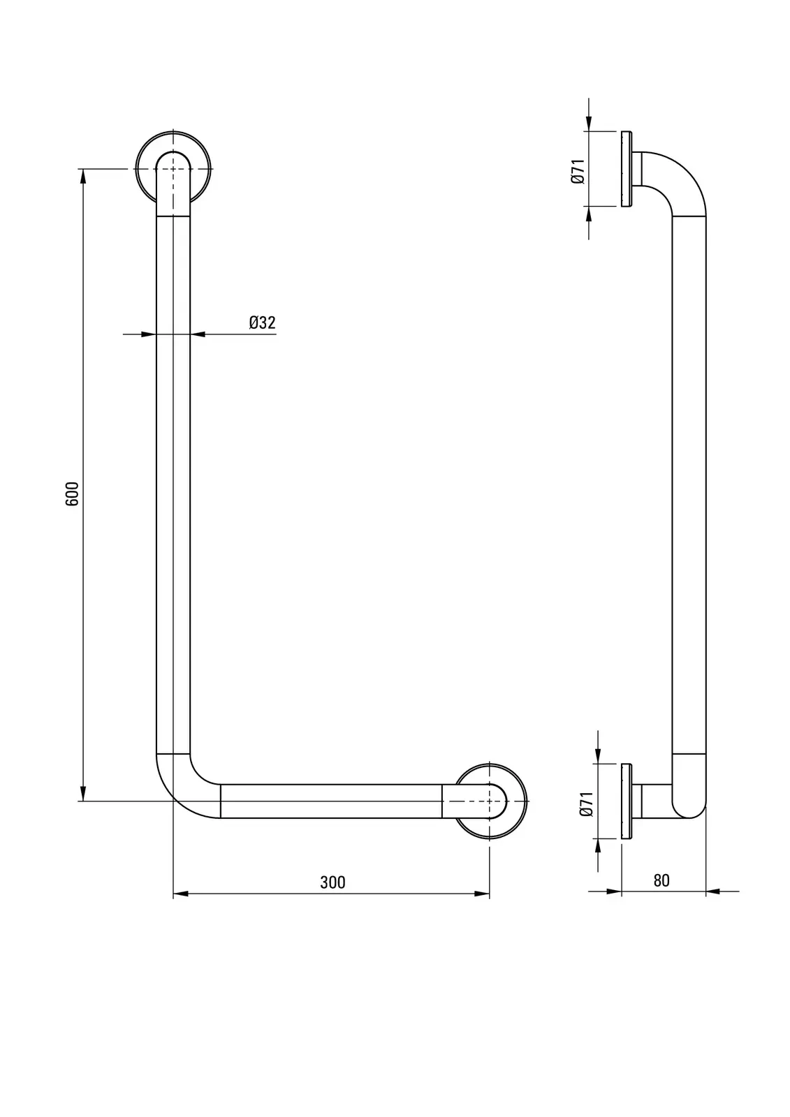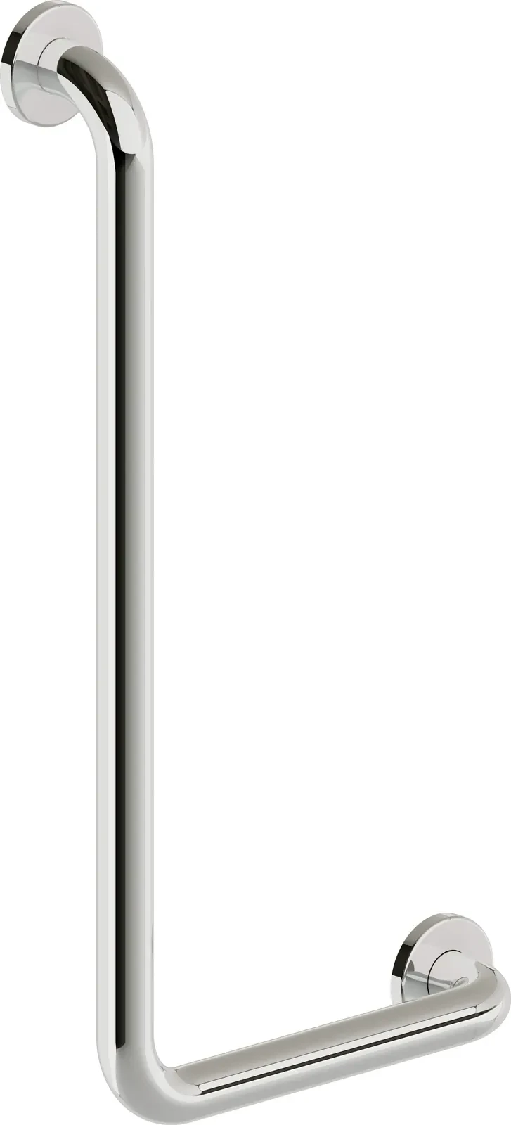 Uchwyt przyścienny kątowy, lewy. Wykonany został ze stali nierdzewnej. Rozety o średnicy 71mm są wykonane są z tworzywa sztucznego i pokryte błyszczącym chromem. W komplecie zestaw montażowy do twardego podłoża (ściany z pełnej cegły/ betonu). Maksymalny udźwig 150 kg. Produkt jest wyrobem medycznym.