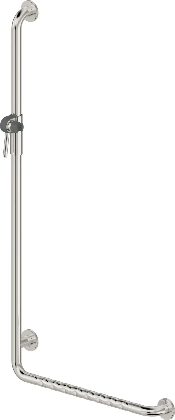 Uchwyt przyścienny kątowy, lewy wyposażony jest w regulowany uchwyt na słuchawkę prysznicową. Wykonany ze stali nierdzewnej. Pionowe ramię jest gładkie, poziome ma powierzchnię falistą. W komplecie zestaw montażowy do twardego podłoża (ściany z pełnej cegły/ betonu). Maksymalny udźwig 150 kg. Produkt jest wyrobem medycznym.