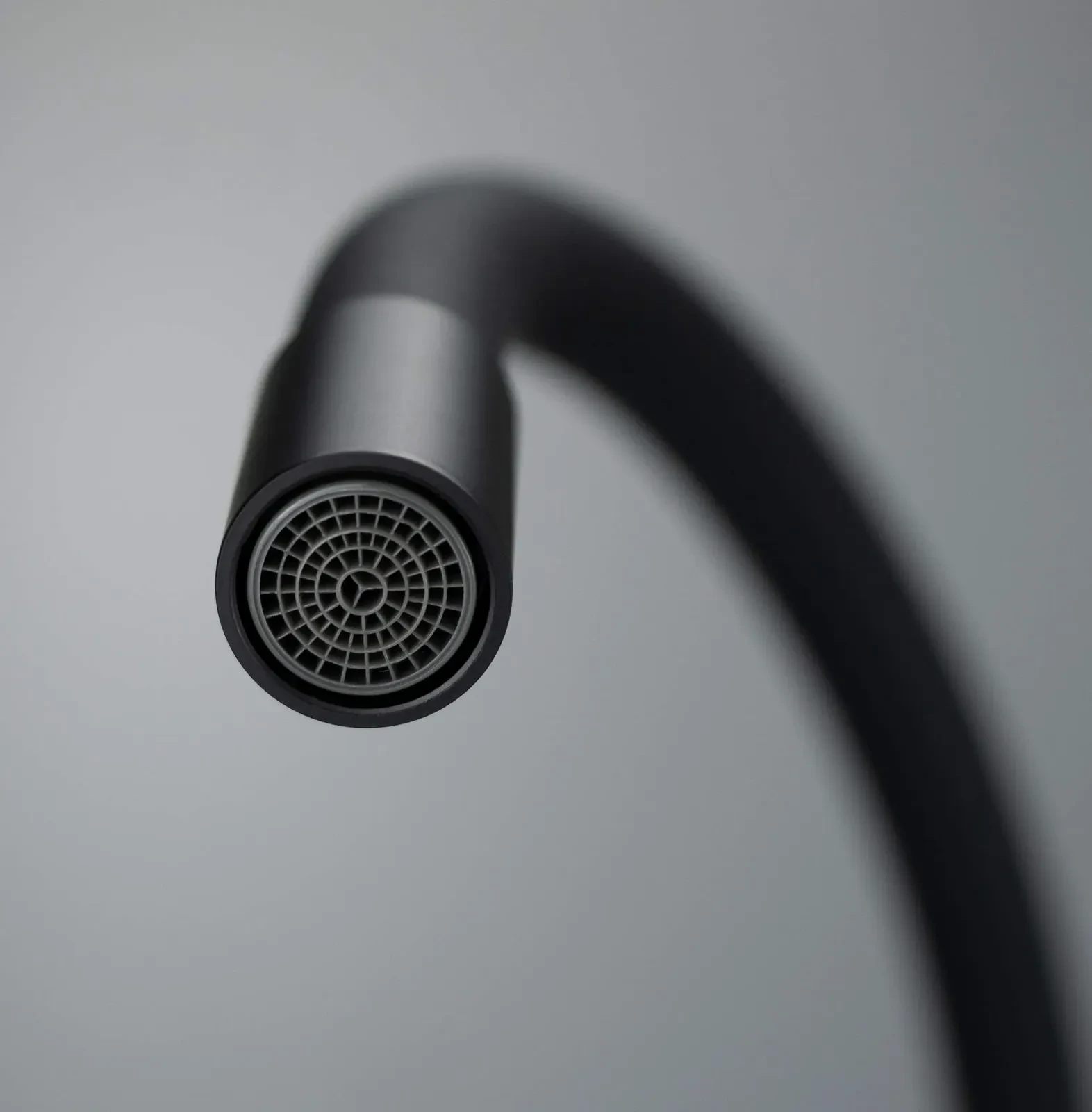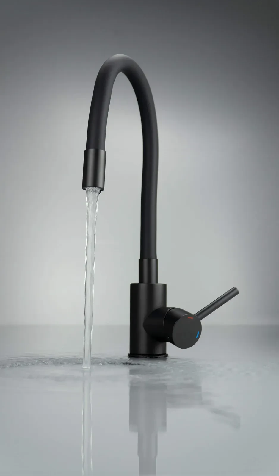 Bateria kuchenna z giętą wylewką z linii Luno łączy elegancję i praktyczne rozwiązania.