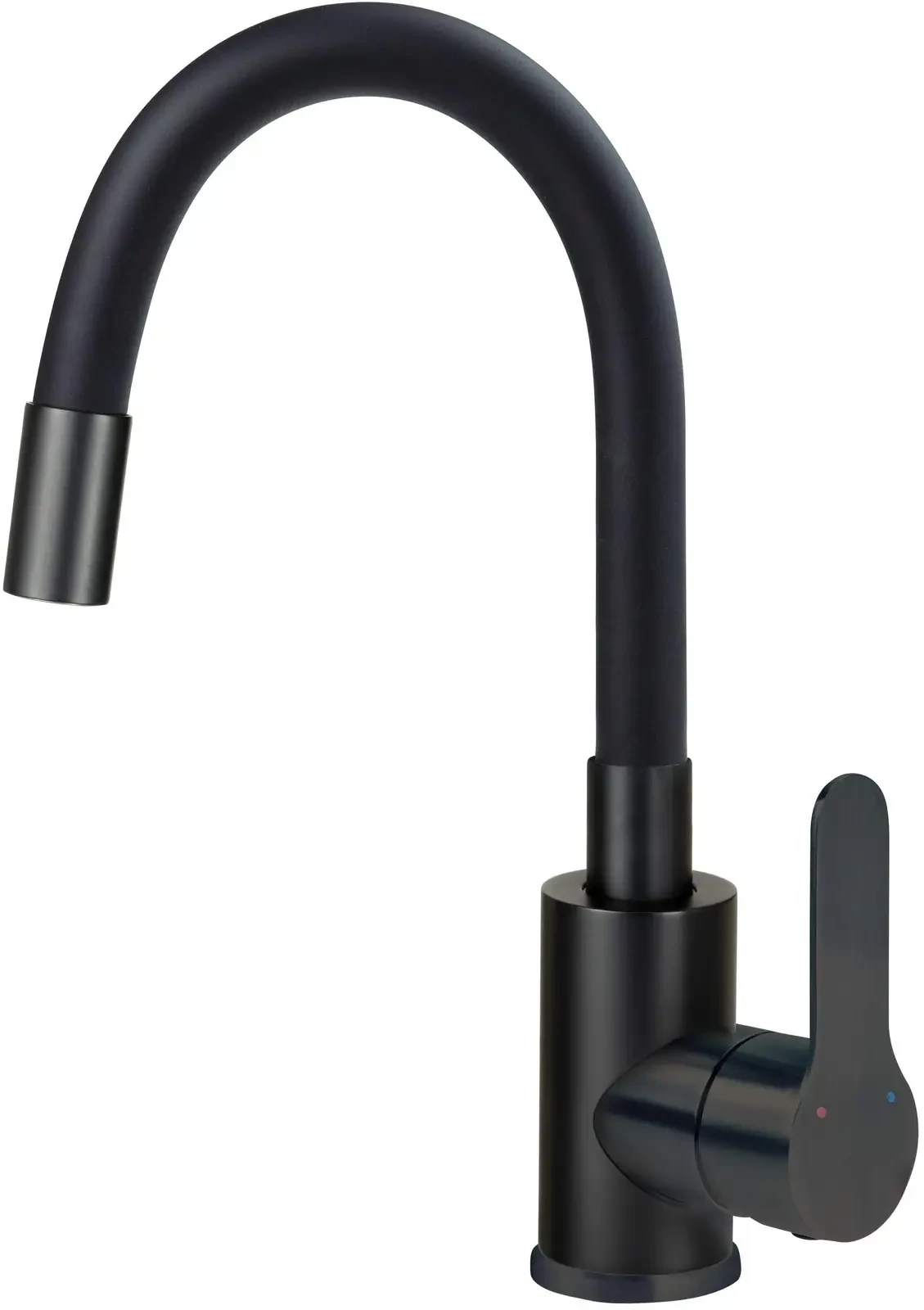 Ta praktyczna bateria została stworzona z myślą o maksymalnym komforcie codziennego użytkowania. Gięta wylewka w kolorze czarnym nie tylko dodaje elegancji, ale także jest niezwykle praktyczna. Umożliwia łatwe napełnianie większych pojemników i utrzymanie czystości w umywalce. Zintegrowany aerator zapewnia oszczędność wody, tworząc miękki, napowietrzony strumień. Korpus wykonany ze stali nierdzewnej gwarantuje długotrwałą trwałość oraz odporność na korozję. Czarna powłoka nie tylko nadaje baterii nowoczesny wygląd, ale także jest łatwa w utrzymaniu w czystości, co jest kluczowe w codziennym użytkowaniu. Dodatkowo, bateria jest wyposażona w wężyki przyłączeniowe i tuleję montażową.
