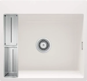 Magnetic o długości 560 mm w jasnym kolorze alabaster to elegancka propozycja do każdej nowoczesnej kuchni. Zlew wyposażony w koszyki montowane na magnes na bocznej ściance, pozwala na wygodne przechowywanie przyborów kuchennych bez konieczności wiercenia dodatkowych otworów. Granit z właściwościami hydrofobowymi i antyseptycznymi zapewnia łatwość w utrzymaniu czystości oraz wyjątkową trwałość.