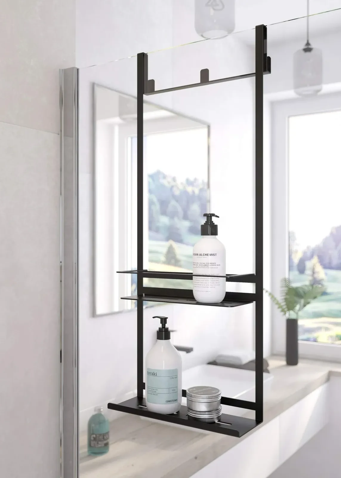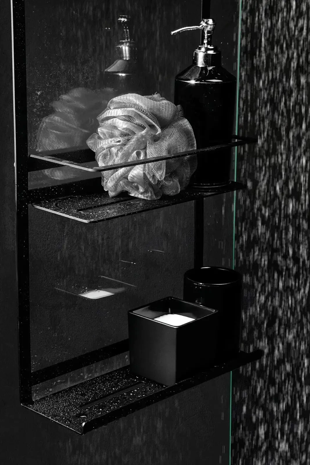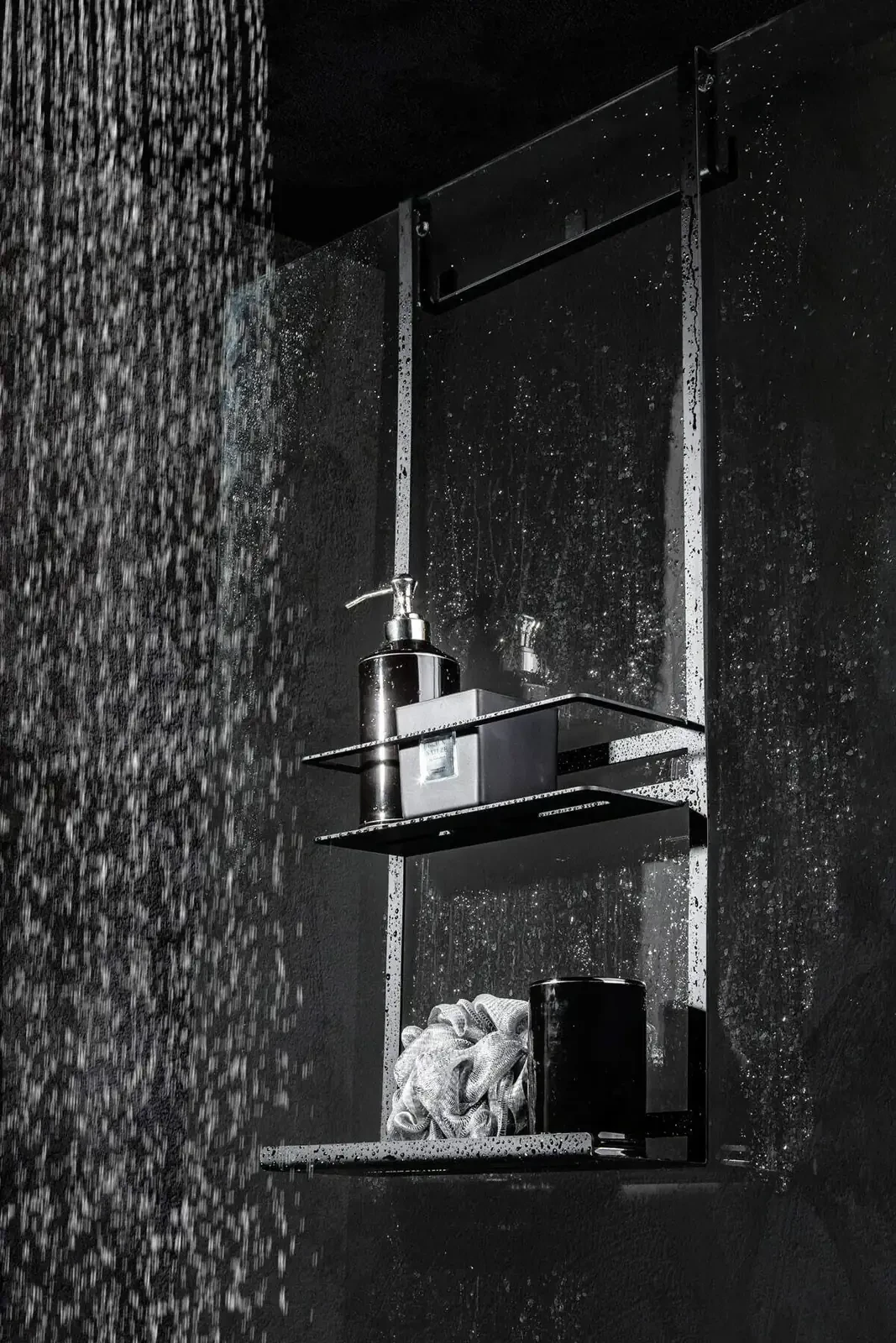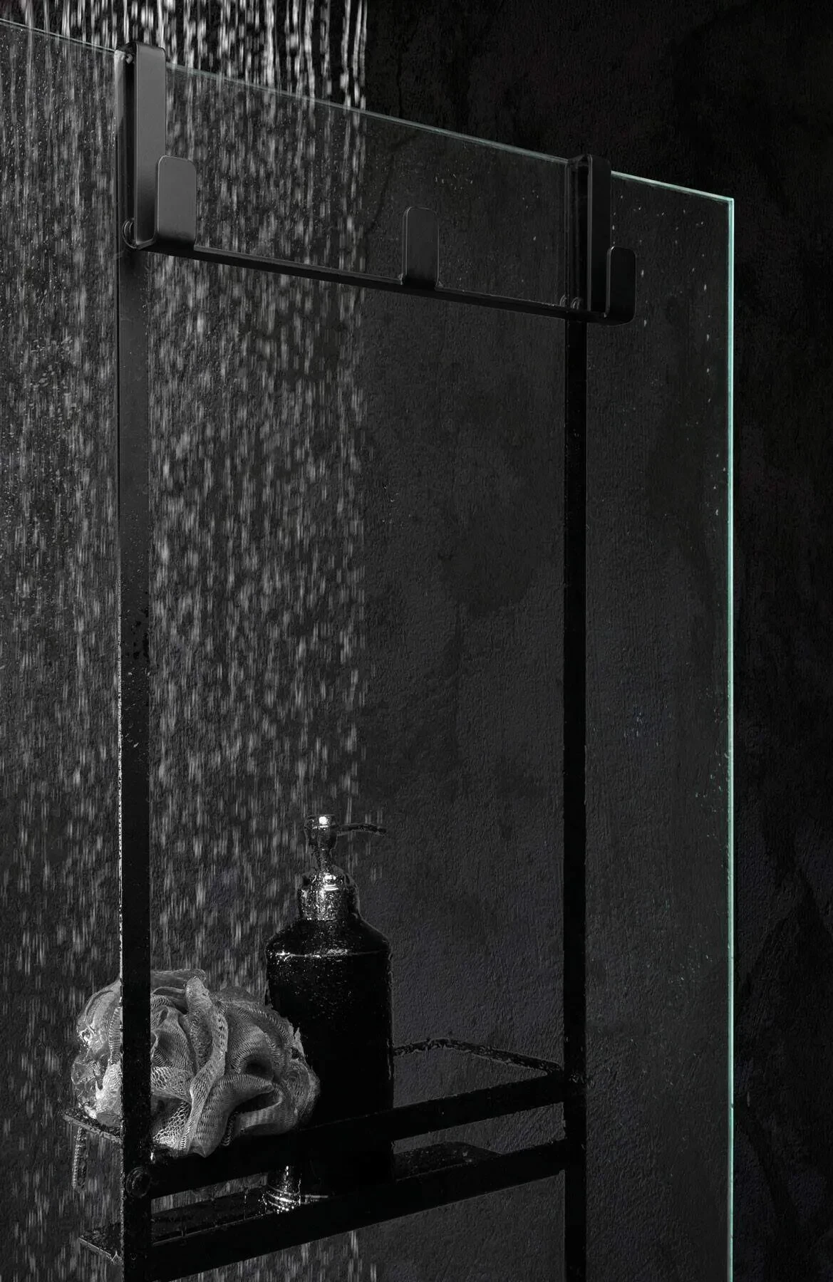 Półka na kabinę typu A z dwiema ażurowymi półkami na akcesoria i trzema haczykami na ręczniki, pochodząca z wyróżnionej nagrodami kolekcji Mokko, to nowoczesne, minimalistyczne, a co za tym idzie proste i funkcjonalne akcesorium, które doskonale odnajdzie się w przestrzeniach współczesnych łazienek i salonów kąpielowych. Wykonaną z 2,5 mm stali półkę wiesza się na szybach stałych kabiny i kabinach typu walk-in, półkami na akcesoria do wewnątrz i haczykami na ręczniki na zewnątrz. Poza bezproblemowym montażem, akcesorium to charakteryzuje się minimalistycznym designem, ergonomią, wysoką jakością wykonania, starannym wykończeniem i pięknym odcieniem głębokiej czerni. Satynowoczarne akcesoria z linii Nero wyjątkowo efektownie harmonizują z czarną armaturą, gładkimi kaflami łazienkowymi, drewnianymi czy kamiennymi blatami. Dodatki te świetnie odnajdą się w pomieszczeniach urządzonych w stylu industrialnym, skandynawskim czy minimalistycznym. Kolekcja akcesoriów łazienkowych Mokko autorstwa Kasi Łogwinienko i Michała Łoja została doceniona za jej wzornictwo, technologię wykonania, innowacyjność oraz funkcjonalność i otrzymała nagrodę Diament Meblarstwa 2020, oraz została Finalistą konkursu Dobry Wzór 2020.