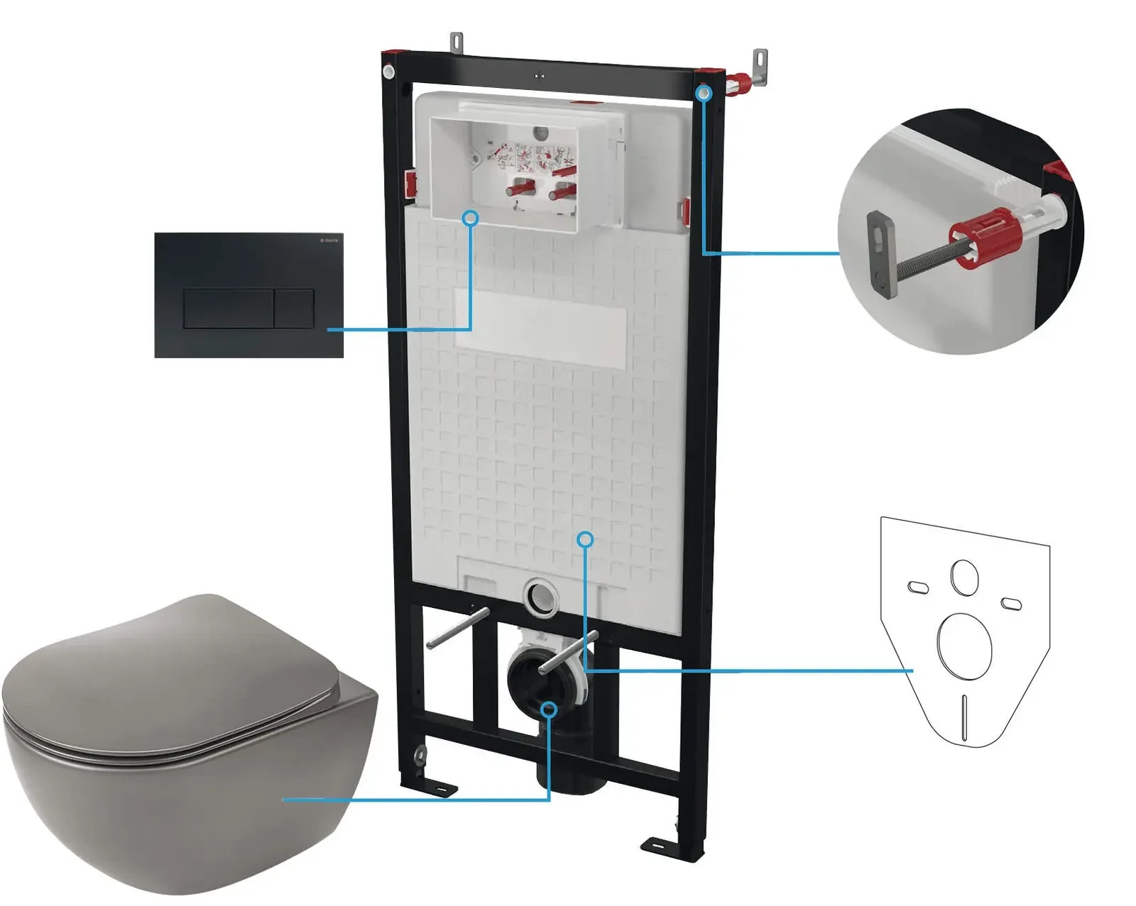 Zestaw WC podtynkowy kompletowany jest z czarnego przycisku sterującego, miski bezkołnierzowej z deską wolnoopadającą oraz maty wygłuszającej. Miska nie posiada kołnierza, pozbawiona jest zbędnych zakamarków, gdzie mógłby się osadzać bród. A jej wyjątkowe antracytowe wykończenie zachwyci miłośników ekstrawaganckich wnętrz. Ponadto podkładka akustyczna podwyższa komfort użytkowania, a mata wygłuszająca niweluje nierówność między płytką i miską WC. Całość jest stabilna dzięki stalowej ramie i prezentuje się bardzo estetycznie i elegancko.