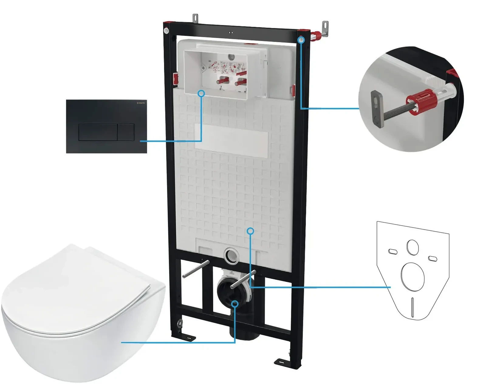 Kompletny, przeznaczony do montażu podtynkowego zestaw 6w1 z miską ustępową bezkołnierzową wiszącą z kolekcji Peonia Zero New, pozwoli Ci w szybki i łatwy w montażu sposób, zaaranżować nowoczesną, estetyczną i wygodną do utrzymania w czystości toaletę. Charakteryzująca się zaokrąglonymi kształtami kolekcja Peonia idealnie sprawdzi się w łazienkach urządzonych w minimalistycznym stylu, w tym także tych o niewielkim metrażu. Ceramiczna, podwieszana miska WC z cicho opadającą, cienką deską Slim oraz przyciskiem spłukującym w eleganckim wykończeniu w głębokim, czarnym kolorze, charakteryzuje się brakiem standardowego kołnierza bez trudnych do utrzymania w czystości kątów, rantów i zakamarków. Design miski nie tylko skraca czas czyszczenia toalety i ilość wykorzystywanych do tego detergentów, ale także sprawia, że do spłukania muszli potrzeba mniej wody, co zmniejsza jej zużycie i jest zgodne z filozofią Proeco marki Deante. Miskę montuje się na ścianie za pomocą znajdującego się w zestawie stelaża podtynkowego.