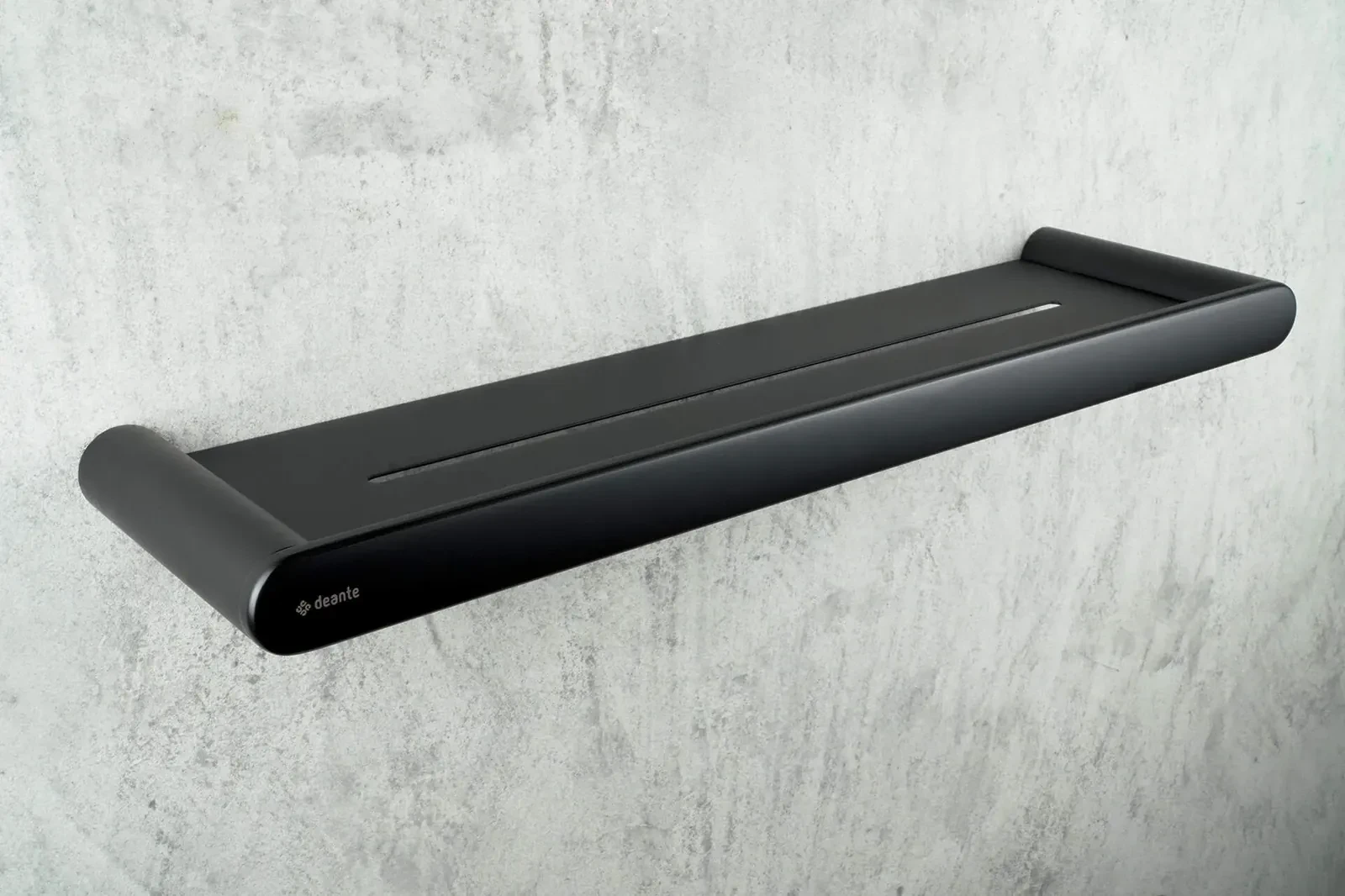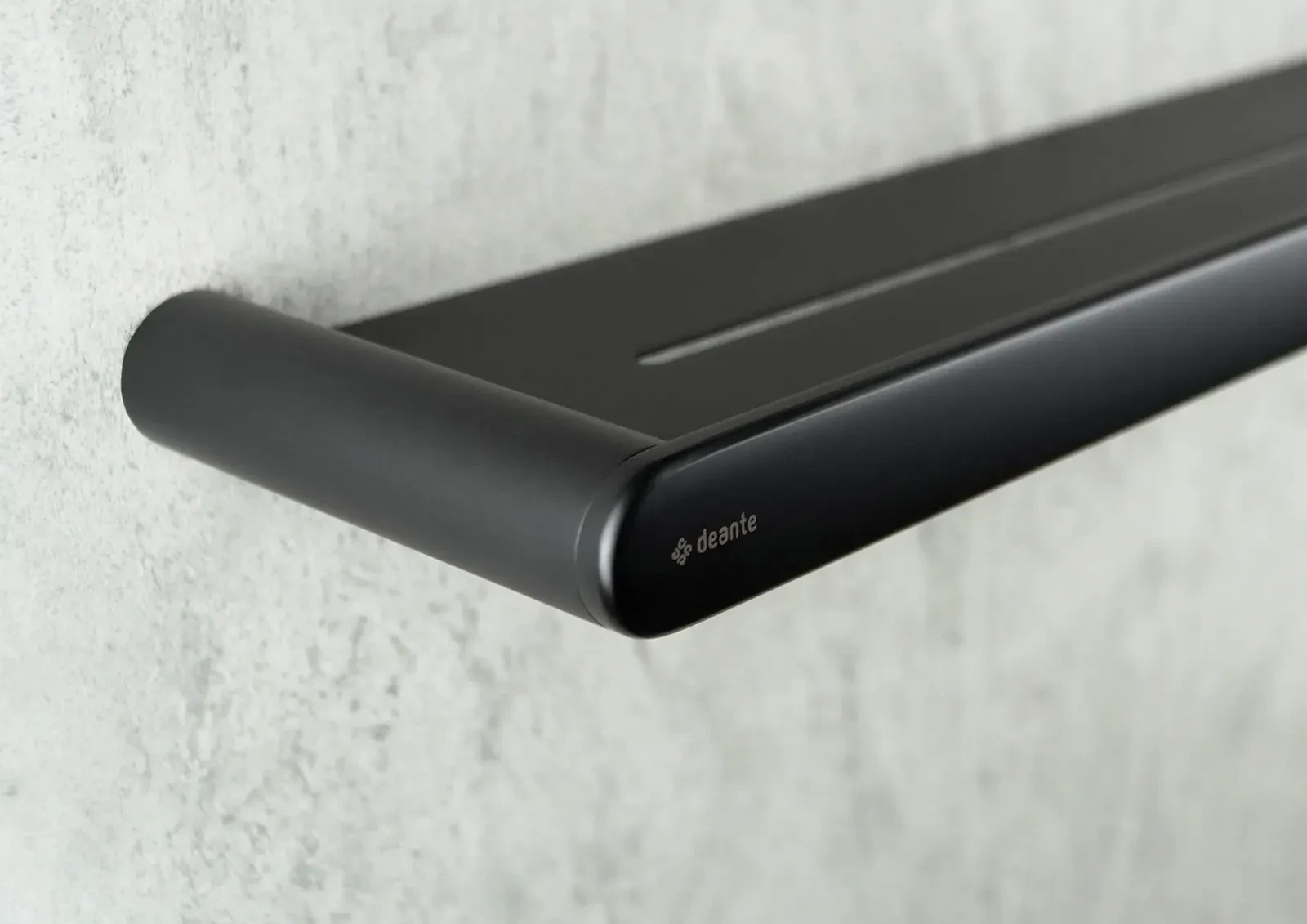 Półka ścienna z kolekcji Round sprawdzi się zarówno w kabinach prysznicowych, jak i w okolicy wanny, czyli wszędzie tam, gdzie potrzebne jest dodatkowe miejsce na kosmetyki. Wykonana ze stali nierdzewnej, wykończona w eleganckim, czarnym macie będzie doskonale komponować się z bateriami i dodatkami w tym samym kolorze.