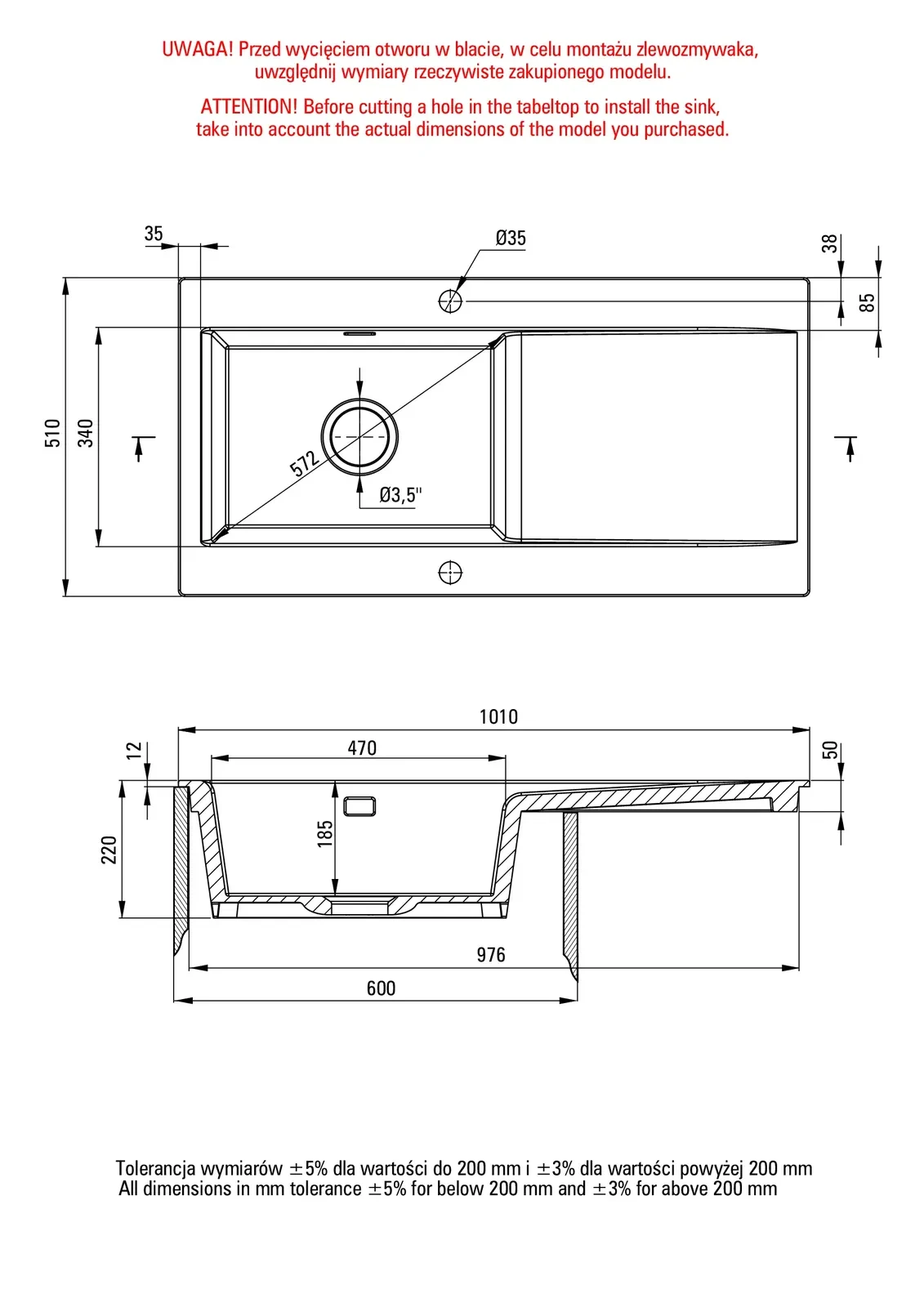 – Wycięcie w blacie (wpuszczany) - szerokość (mm): 490