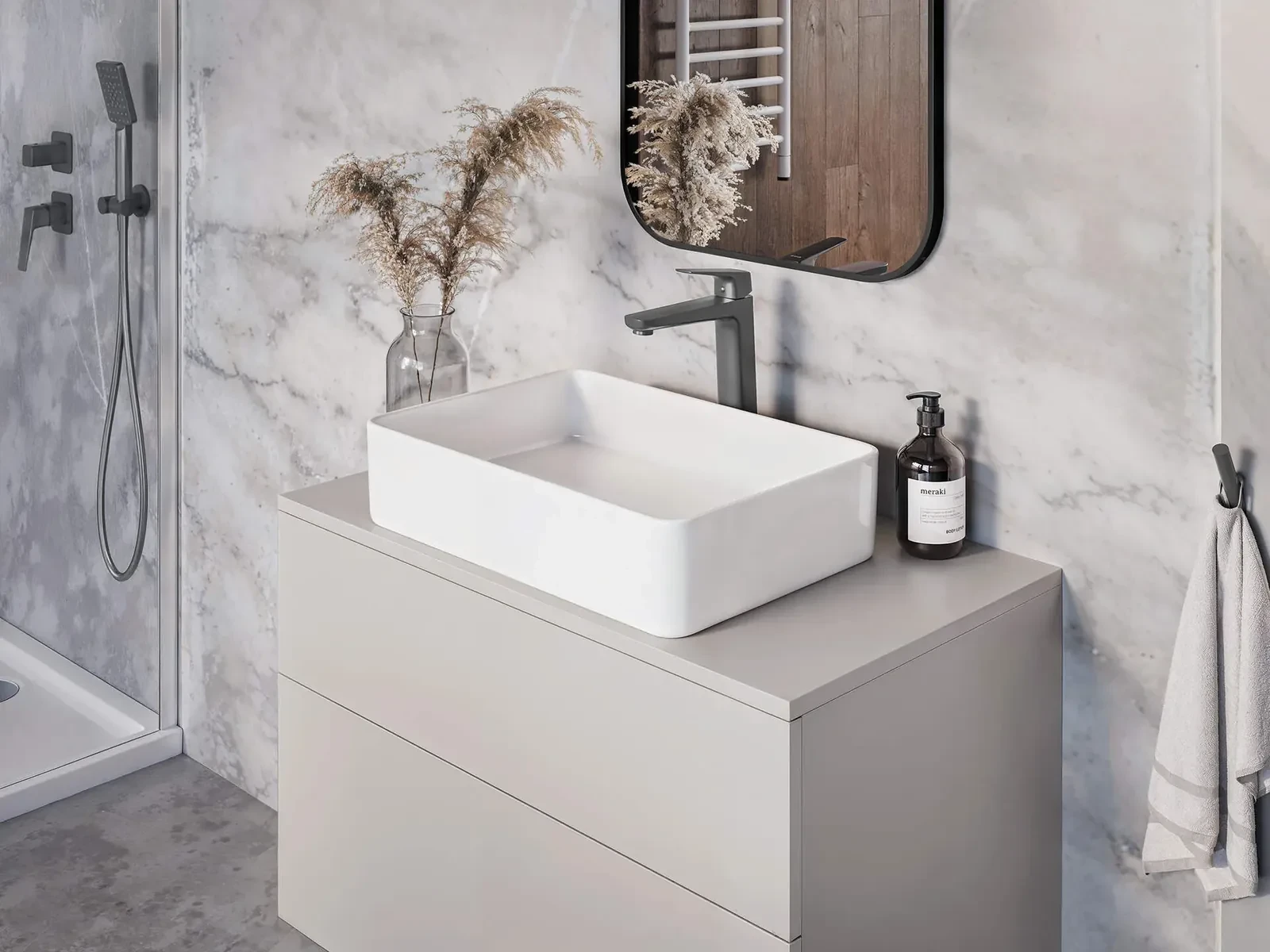 Neutralna forma wpisuje się w różne style aranżacji – od minimalistycznych po klasyczne. Wykończenie titanium podkreśla estetykę i ułatwia dopasowanie.