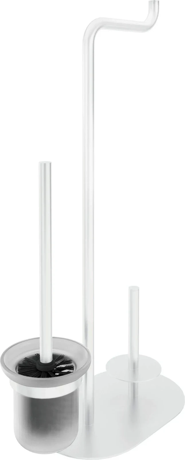 Stojak 3-funkcyjny z kolekcji Silia w białym, matowym wykończeniu, jest wszechstronnym akcesorium łazienkowym, które łączy w sobie uchwyt na papier toaletowy, miejsce na zapas rolki oraz szczotkę WC. Wykonany z mosiądzu, stojak charakteryzuje się wyjątkową solidnością i trwałością. Matowe wykończenie w kolorze bieli dodaje nowoczesnego charakteru i jest idealne dla tych, którzy preferują minimalistyczny styl lub chcą ożywić swoją łazienkę subtelnym, ale stylowym akcentem.