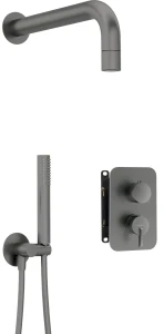 Komplet natryskowy z kolekcji Silia to przykład harmonijnego połączenia nowoczesnych rozwiązań technologicznych z minimalistycznym designem. Składa się on z wylewki z małą głowicą prysznicową, baterii podtynkowej mieszaczowej oraz słuchawki natryskowej z wężem i uchwytem punktowym. Główka natryskowa tworzy optymalny, stożkowy strumień wody, co zapewnia wyjątkowy komfort kąpieli. Bateria podtynkowa mieszaczowa z łatwym przełącznikiem umożliwia sprawne przełączenie strumienia wody między słuchawką a wylewką. Dodatkowo, słuchawka prysznicowa wyposażona w system cool-out nie nagrzewa się, zwiększając bezpieczeństwo i komfort, a wąż prysznicowy z systemem anti-twist zapobiega skręcaniu, co podnosi wygodę użytkowania. Montaż podtynkowy gwarantuje estetyczny wygląd i ułatwia utrzymanie w czystości. Całość jest dopracowaną kompozycją w intrygującym wykończeniu titanium, która wpisuje się w nowoczesne wnętrza łazienkowe, łącząc w sobie elegancję i funkcjonalność.