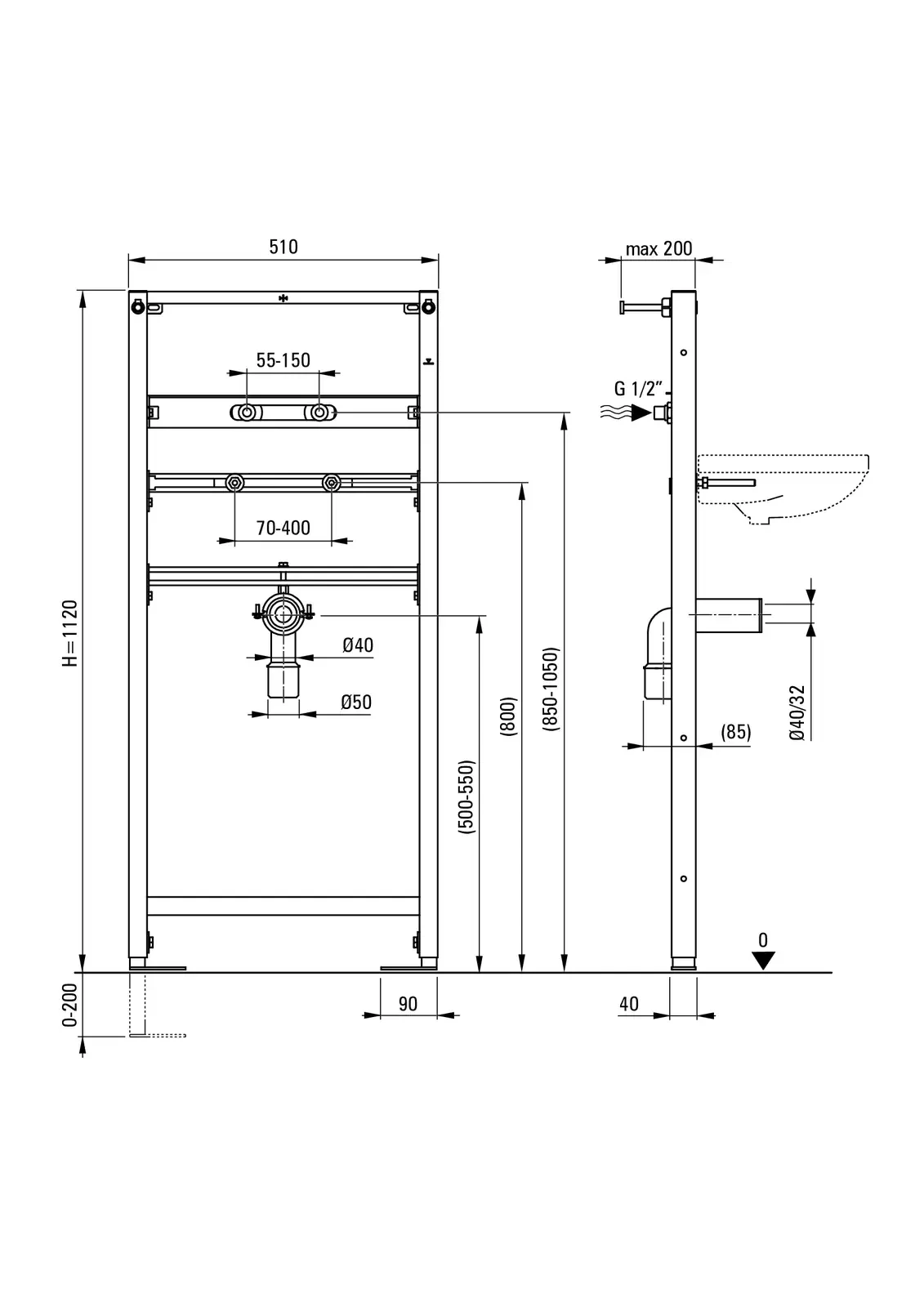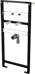 Stelaż przeznaczony do montażu umywalek wiszących z możliwością instalacji baterii stojącej. Konstrukcja doskonale sprawdza się zarówno przy montażu bezpośrednio do ściany nośnej, jak i w zabudowie z płyt gipsowo-kartonowych. Solidna, samonośna rama wykonana z trwałego metalu malowanego proszkowo zapewnia stabilność oraz odporność na korozję. Wyposażony jest w regulowane rozpórki oraz regulowane nogi kotwiące z hamulcem w zakresie 0–200 mm. Rozstaw przyłączy wodnych można dostosować w szerokim zakresie od 80 do 300 mm, co ułatwia dopasowanie do różnych instalacji hydraulicznych. Przemyślana konstrukcja ramy pozwala na łatwy i bezpieczny montaż w różnych typach ścian.