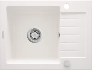 Alabastrowy, granitowy zlewozmywak 1-komorowy Zorba z jedną przestronną, prostopadłościenną komorą i krótkim ociekaczem to produkt, który doskonale prezentować się będzie zarówno w klasycznych, jak i minimalistycznych aranżacjach kuchni. Bardzo jasny odcień akcesorium będzie efektownie kontrastować z czarnym blatem bądź idealnie wtopi się w przestrzeń roboczą kuchni, zaaranżowaną za pomocą jasnego kamienia lub kompozytu. Prezentowany tu zlewozmywak z ociekaczem wykonany został z granitu i charakteryzuje się wszystkimi zaletami typowymi dla tego niezwykle twardego i odpornego na użytkowanie materiału. Należy do nich odporność na przebarwienia, zarysowania, szok termiczny, temperaturę 250 stopni jak i uderzenia. Ponadto zlewy z kolekcji posiadają właściwości hydrofobowe, co oznacza, że ich powierzchnia nie tylko nie przepuszcza cząsteczek wody, ale także je odpycha, dzięki czemu są dużo łatwiejsze do utrzymania w czystości. Wszystkie te zalety, jak również współczesny, ascetyczny design, eleganckie kolory i uniwersalny charakter sprawiły, że kolekcja zlewozmywaków Zorba wyróżniona została tytułem finalisty konkursu Dobry Wzór 2014 r.