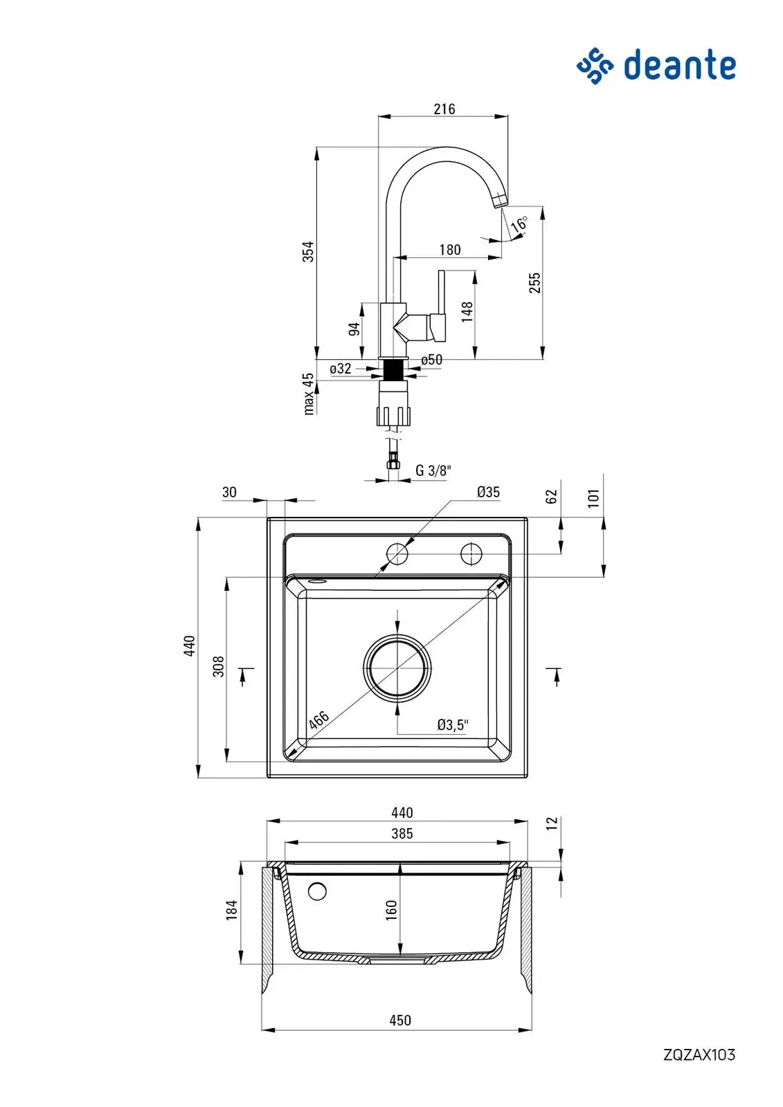 Deante Zorba Zlewozmywak granitowy z baterią 1 – dane techniczne i specyfikacja