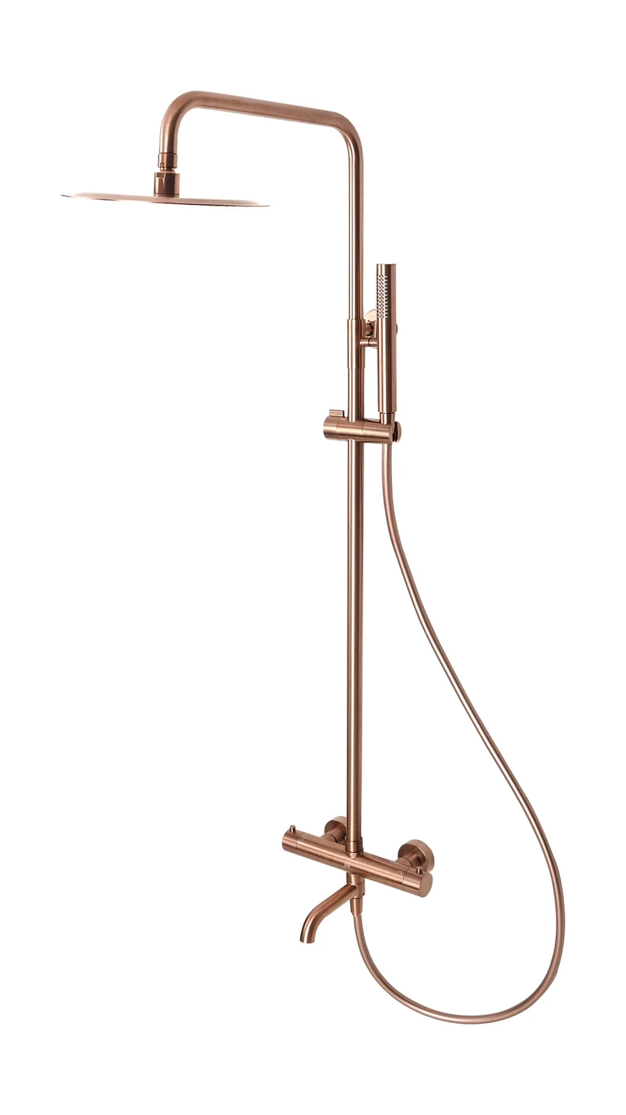 Emporia FLY – kolumna natryskowa termostatyczna 3?funkcyjna z deszczownicą ?250 mm i wylewką wannową, miedź szczotkowana | armatura prysznicowa