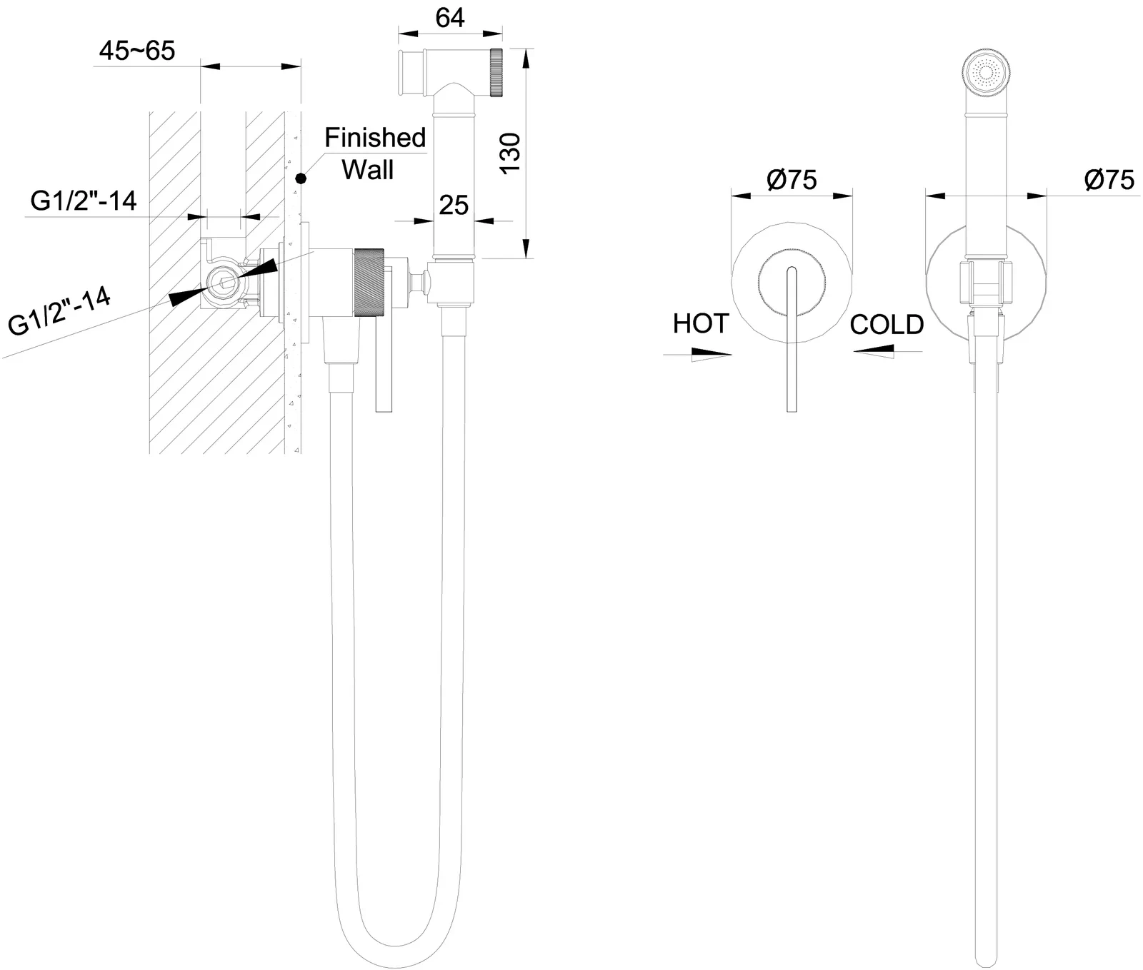 - Wyposażenie: słuchawka bidetowa z przyciskiem, uchwyt ścienny, wąż elastyczny, dwie rozety maskujące.