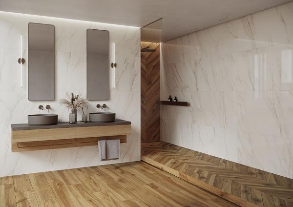 Format 9,8×59,8 cm w wersji lewostronnej chevron doskonale komponuje się z płytkami prawostronnymi z kolekcji Freeland Gold, co umożliwia tworzenie harmonijnych i efektownych układów podłogowych i ściennych.
