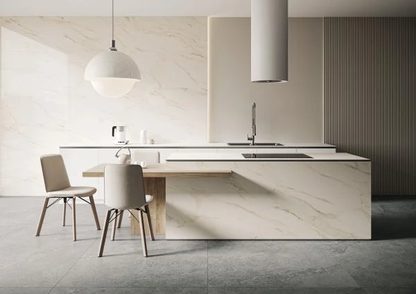 Duży format 119,8×279,8 cm sprawia, że płytka idealnie prezentuje się w przestronnych wnętrzach, tworząc spektakularny efekt jednolitej tafli. Złota kolorystyka świetnie współgra z bielą, czernią i naturalnym kamieniem, nadając wnętrzom elegancji i ciepła.