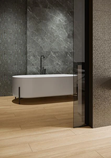 Płytka o rektyfikowanych krawędziach umożliwia układanie z minimalną fugą, co pozwala uzyskać efekt jednolitej, nowoczesnej powierzchni. Świetnie sprawdza się w łazienkach, strefach wellness, kuchniach i salonach kąpielowych, gdzie odcień grafitu tworzy eleganczne, surowe tło dla ceramiki sanitarnej i wyposażenia.