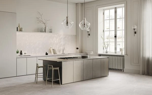 Duży format 119,8×279,8 cm doskonale sprawdza się w przestronnych wnętrzach, podkreślając ich nowoczesny charakter. Szara tonacja w satynowym wykończeniu komponuje się z drewnem, bielą i ciemniejszymi akcentami, dając szerokie możliwości aranżacyjne.