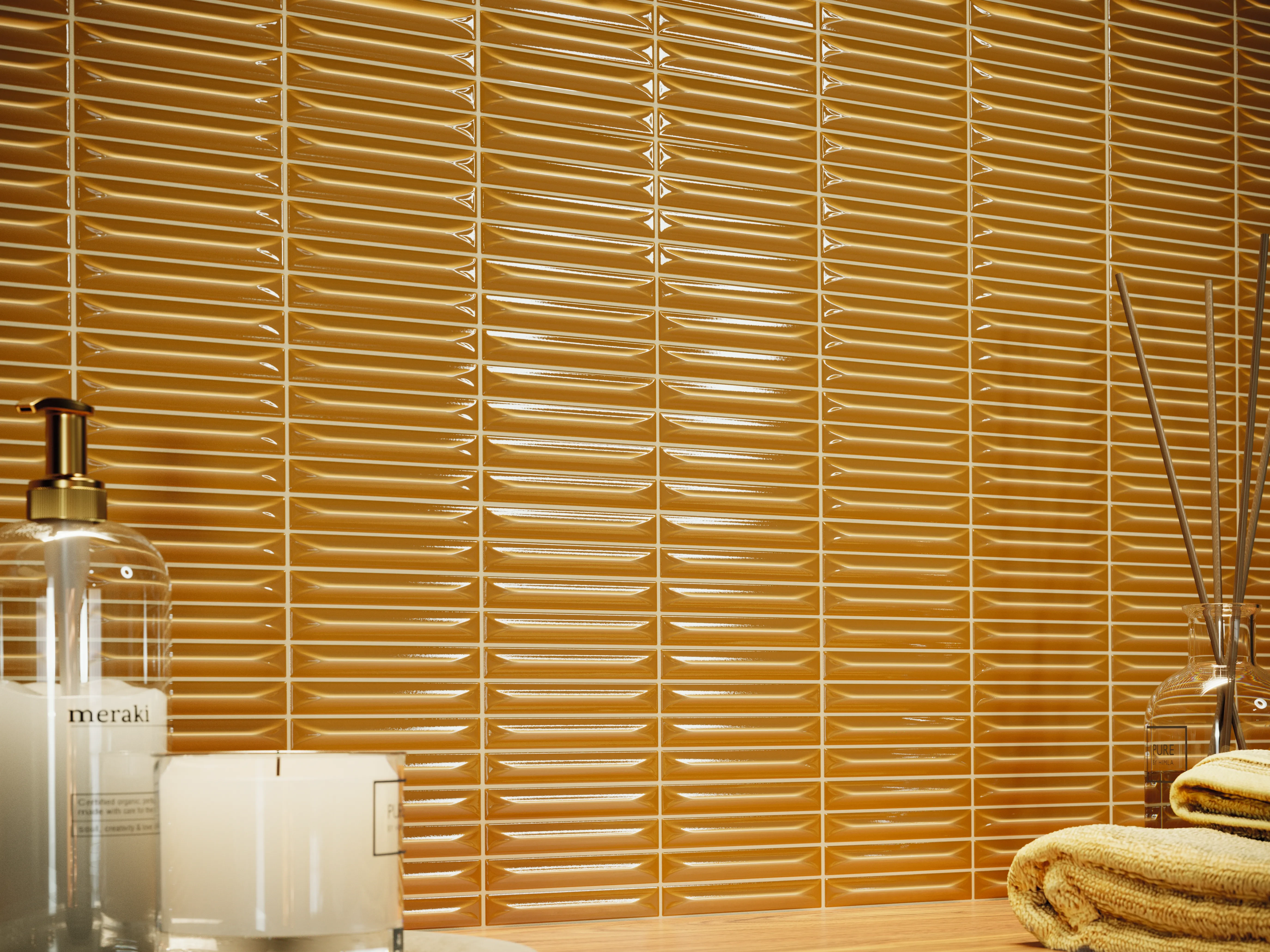 Miodowa płytka ścienna Vilar Albaro Arrow Honey (20x20 cm) to radosny i ciepły akcent wykończeniowy. Zastosowany podział lica naśladuje precyzyjną mozaikę ułożoną z wąskich pasm (1,5x10 cm), co znakomicie usprawnia prace montażowe, zachowując efekt drobnej plecionki. Musztardowy odcień w połączeniu z mocno lśniącym szkliwem wspaniale rozświetla wnętrze, dodając łazienkom i kuchniom pozytywnej energii oraz gwarantując łatwość w codziennym utrzymaniu czystości.